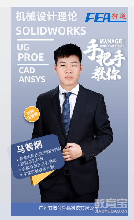 【详情】 广州有道计算机科技有限公司是一家专业的有限元分析、非标自动化设计、钣金工程、产品设计及机构运动仿真技术服务供应商,致力于为国内外企业及个人提供工程咨询、机械设计培训、产品设计培训、工业设计培训等全方位的产品工程解决方案及CAD/CAE技术的推广。给从事产品开发、工程设计的企业提供先进的专业虚拟原型设计、分析技术和咨询服务,帮助企业提升其研发水平,缩短产品开发周期,降低开发成本,保持市场竞争优势。我们服务过的客户包括:台北东聚、爱派科电源、永立电机、安利、动利电子、锡山集团、雅迪集团、工业和信息化部电子第五研究所、思瑞克斯、然斯康波达、乐瑞、兴世机械、Roca、欧司朗、三友、广汽研究院、广铝、信濠、航新航空、中机建等众多大中型企业。