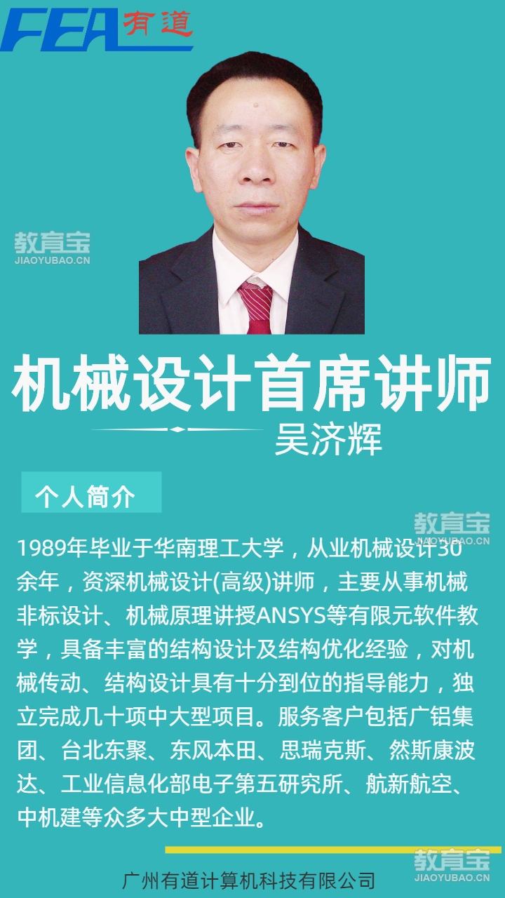 【详情】 广州有道计算机科技有限公司是一家专业的有限元分析、非标自动化设计、钣金工程、产品设计及机构运动仿真技术服务供应商,致力于为国内外企业及个人提供工程咨询、机械设计培训、产品设计培训、工业设计培训等全方位的产品工程解决方案及CAD/CAE技术的推广。给从事产品开发、工程设计的企业提供先进的专业虚拟原型设计、分析技术和咨询服务,帮助企业提升其研发水平,缩短产品开发周期,降低开发成本,保持市场竞争优势。我们服务过的客户包括:台北东聚、爱派科电源、永立电机、安利、动利电子、锡山集团、雅迪集团、工业和信息化部电子第五研究所、思瑞克斯、然斯康波达、乐瑞、兴世机械、Roca、欧司朗、三友、广汽研究院、广铝、信濠、航新航空、中机建等众多大中型企业。