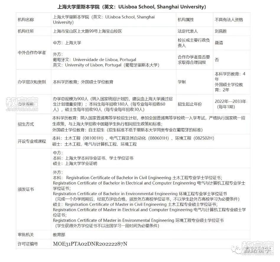 项目介绍 由上海大学和里斯本大学联合共建,是中国大陆与葡萄牙第*所中外合作办学机构。里斯本学院开设3个专业(电气工程及其自动化、土木工程、环境工程)的双学位本科学历教育和外国硕士学位教育项目,首届招收的175名本科生已于2022年9月入学就读。 合作方简介 里斯本大学是葡萄牙*大、*负盛名的综合研究型大学,诞生于1288年,在世界大学学术排名(ARWU2021)中,位列葡萄牙第*,全球151-200位。里斯本大学集聚多领域,在促进科学、技术、艺术和人文的当代发展方面具有得天独厚的地位。它的教学质量、研究和创新、及大学文化吸引了来自世界各地越来越多的人才。