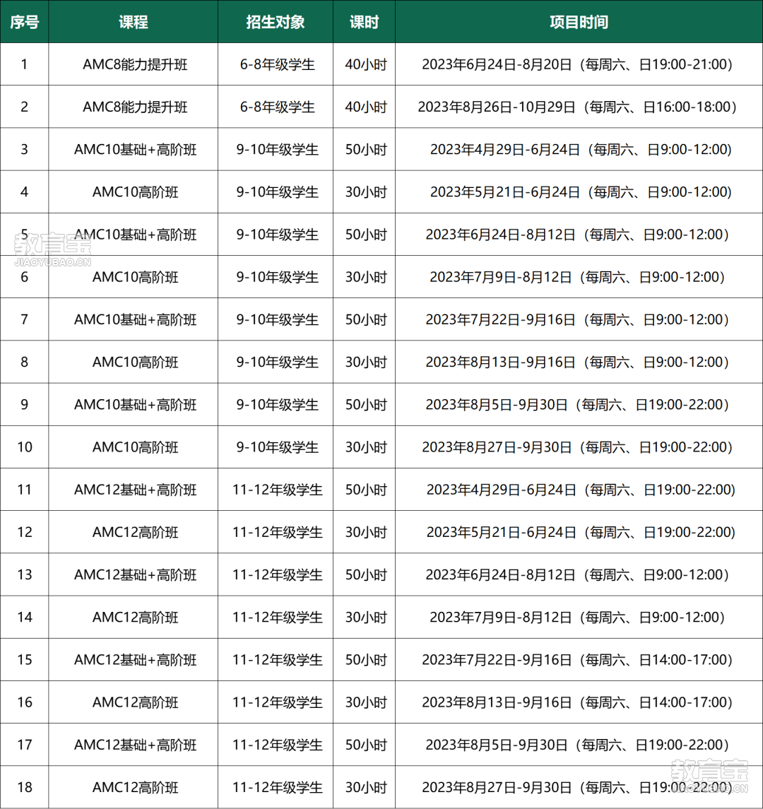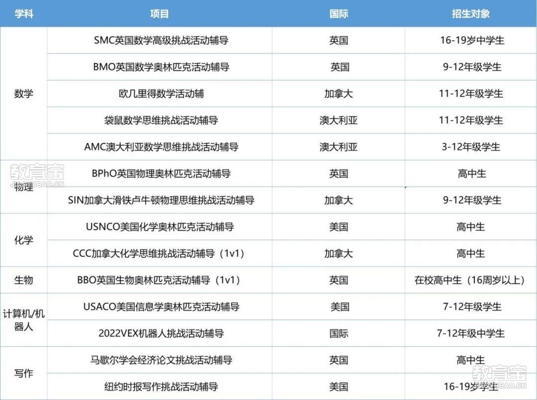 授课形式: 线上 招生对象: AMC8适合6-8年级学生,考试当日不超过14.5岁 AMC10适合9-10年级学生,考试当日不超过17.5岁 AMC12适合11-12年级学生,考试当日不超过19.5岁 欧几里得数学活动辅导 欧几里得数学活动是加拿大滑铁卢大学(University of Waterloo)的数学学院为全球高中生举办的数学活动,被誉为“数学托福”,是全球范围内最具认可度的数学活动之一,含金量极高。欧几里得活动自上世纪70年代开始举办,最近五年已经可以达到每年有来自2000所学校的两万名以上学生(其中约有8000名国际考生,以中国考生为主)参加的规模。滑铁卢大学的数学学院是北美第*个经认可建立的数学学院,同时也是北美地区*大的数学学院,在加拿大数学系排行中连续多年位居第三。此外该校还有带薪实习项目,吸引着世界各地的优秀学生。 项目时间: 综合班:2023年2月11日-3月26日,共40个小时 授课形式: 线上 招生对象: 11-12年级学生 SMC英国数学高级挑战活动辅导 British Mathematical Olympiad(BMO)英国数学奥林匹克活动由成立于1996年的United Kingdom Mathematics Trust(UKMT)英国数学基金会组织的旗下针对高年级中学生的活动项目。UKMT作为英国规模*大的数学活动组织单位,每年会为11-18周岁的学生分不同年龄层的各项,主要侧重于学生的数学能力和逻辑推理技巧。 SMC是UKMT活动体系中面向16-19岁的学生的活动,其中*好的一千名讲参加英国数学奥林匹克BMO活动,中间*优秀的学生将有机会代表英国参加国际奥林匹克活动的选拔体系。 项目时间: 综合班:2023年7月8日-8月20日,共40个小时 考前班:2023年8月26日-9月16日,共20个小时 授课形式: 线上 招生对象: 16-19岁中学生