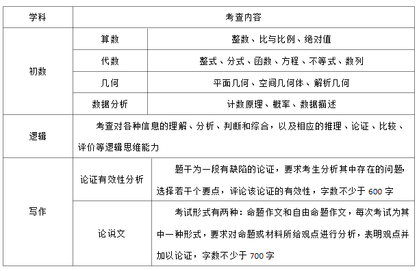 1、数学考察为初等数学,即小初高数学知识的运用,整体难度不大,但考察灵活性强,对知识的组合、建构、运用能力要求较高。2、逻辑推理包含形式逻辑和论证逻辑两大部分,逻辑推理题题干及选项阅读量较大,因此对考生的阅读速度与抓取关键信息能力要求较高。3、写作包含论证有效性分析与论说文两个部分。论证有效性分析,要求能较快地找出一段论证中的漏洞同时给出合理充分的理由,对学生的论辩思维要求较高。论说文,与初高中议论文相似,但其对文章论证性的要求比议论文要高很多。4、英语英语难度介于四六级之间,试题中的阅读理解能力与考生的词汇量、逻辑思维能力直接相关,同时,阅读的技巧性较强,需要考生充分掌握审题、做题的技巧,否则很难拿到理想分数。