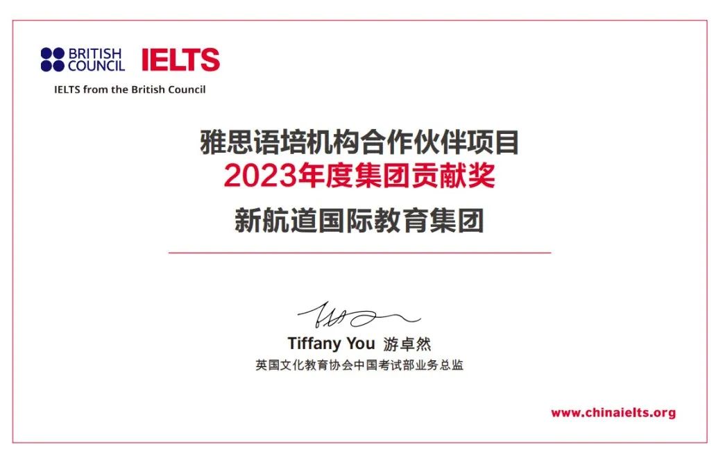 砥砺前行,未来可期新航道旗下学校连续11年被雅思官方授予“雅思考试白金级合作伙伴”称号2023年雅思官方合作伙伴评级,新航道共获15项大奖其中雅思官方9个白金级合作伙伴,新航道所属分校斩获3个。新航道国际教育集团由于在雅思及语言培训的地位,被雅思官方授予“集团贡献奖”的荣誉。