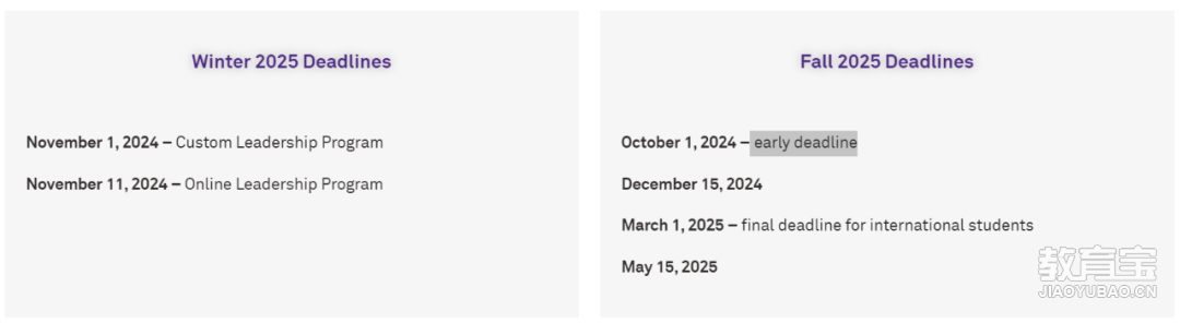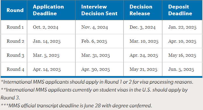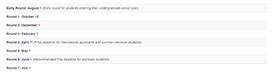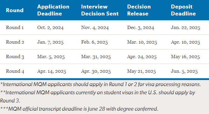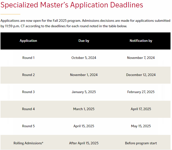 · 申请要求:*专业背景:理学、科技、工程、数学、商科、经济或其他量化类专业背景,且数学、统计学和计算机科学等定量课程*优秀*语言*:不要求托福、雅思等语言**GMAT/GRE:要求管理研究硕士:商业基础Master of Management Studies: Foundations of Business该项目属于杜克大学富卡商学院,是杜克大学富卡商学院专门为新近毕业生开设的一个项目,全日制时长10个月,已获得STEM认证,可享受最长36个月OPT。· 2025秋季申请截止日期如下:第*轮:2024年10月2日第二轮:2025年1月14日第三轮:2025年3月5日第四轮:2025年4月14日· 注:1. 国际申请人应在第*轮或第二轮申请,以便办理签证;2. 目前在美国持有学生签证的国际申请人应在第三轮之前申请。