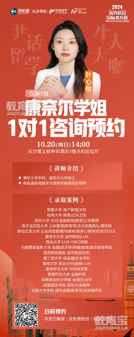 ?10月20日(周日)新航道秋季海外院校教育展清华本科&康奈尔硕士学姐将亲临现场带来干货讲座分享自身从清华到康奈尔的成功之路??现开启一对一面谈咨询预约通道??(仅限5组 先到先得)▼ 扫码立即报名 ▼