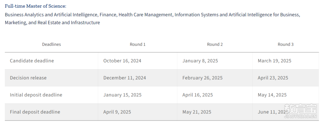 *金融学*信息系统*市场营销*健康保健管理*房地产和基础设施*商业分析与人工智能申请截止日期:第*轮:2024年10月16日第二轮:2025年1月8日第三轮:2025年3月19日