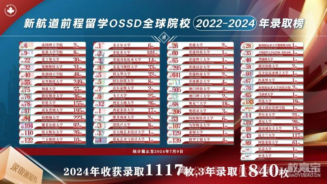 2024申请季新航道前程留学OSSD学子已收到来自英国/加拿大/澳洲//新西兰/荷兰/新加坡/瑞士/香港(中国)等国家及地区录取Offer超1110封。录取院校囊括了帝国理工学院、麦吉尔大学、多大、伦敦大学学院、爱丁堡大学、伦敦国王学院、昆士兰大学、渥太华大学、女王大学等几十所世界学校。不论从院校的层次上来看,还是专业热度,新航道前程留学OSSD都能为学子们实现留学梦想。