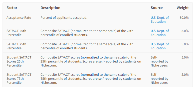 评选因素:除了实际录取*(占据80%),还有基于美国教育部给出的SAT/ACT录取参考值以及学生给出的自评情况。