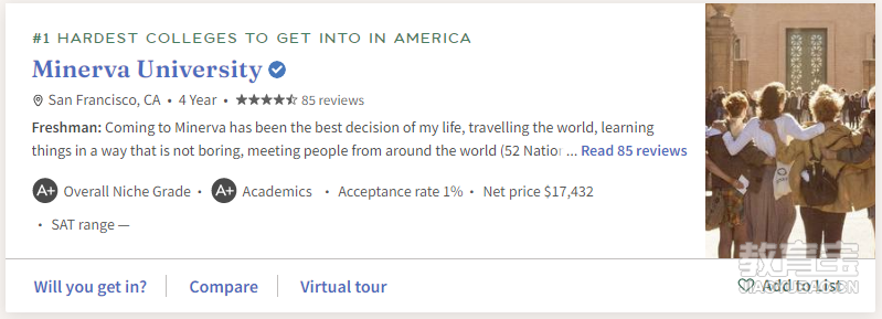 许多同学和家长可能不熟悉密涅瓦大学,它被称为“颠覆常春藤教育的未来大学”,校址虽位于旧金山,但所有的课程都在线上进行。通过全球化的学习体验和先进的教学方法,为学生提供高质量、跨学科的教育。没有线下校园,没有固定城市。在Minerva的四年里,学生们将会共同前往全球七个城市旅学:从旧金山到韩国首尔、从印度海得拉巴到德国柏林、从阿根廷布宜诺斯艾利斯到英国伦敦,最终飞往中国台北。密涅瓦大学虽然“名不见经传”,但录取难度其实远远高于其他大学。自2021年建校以来就保持着每年约1%的录取*,2万多申请者中只有200多人最终会被录取。