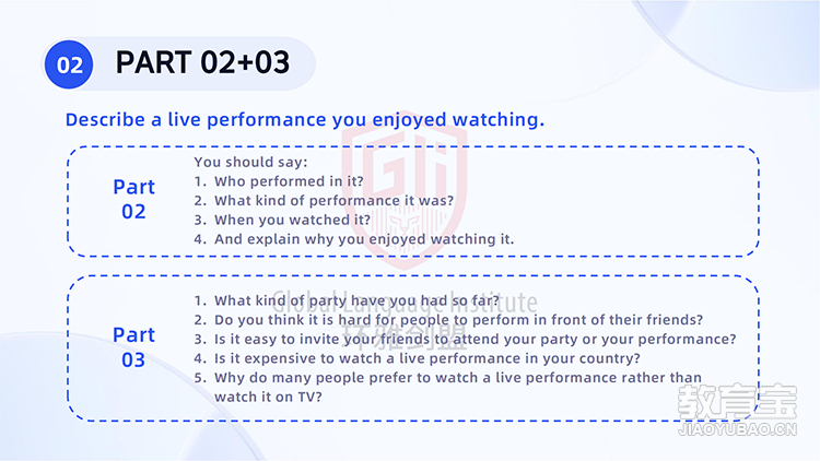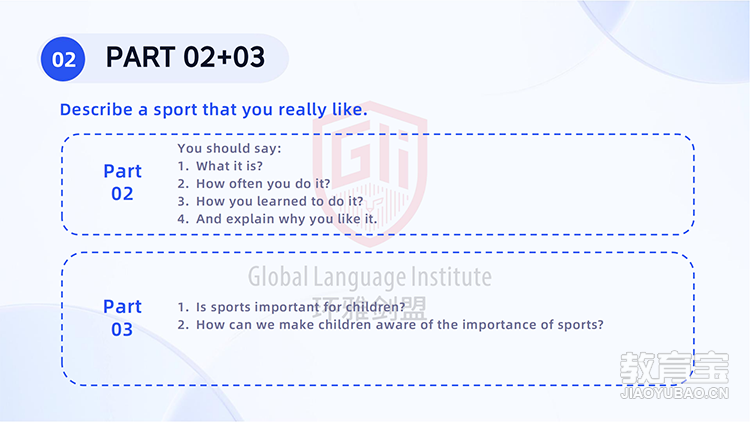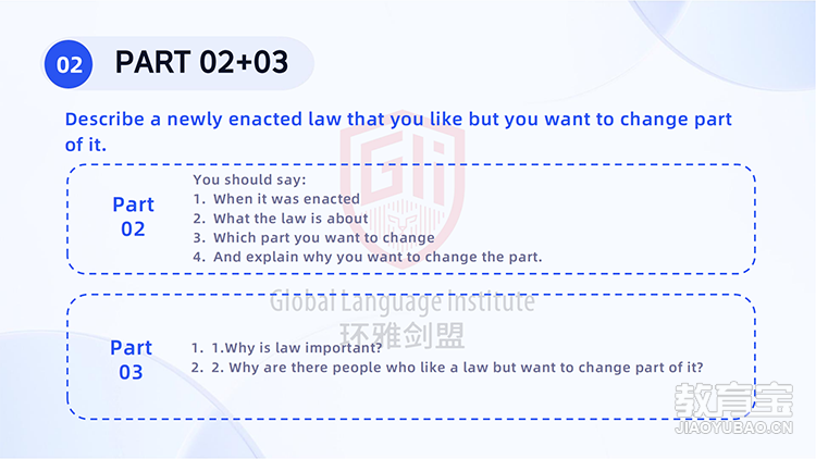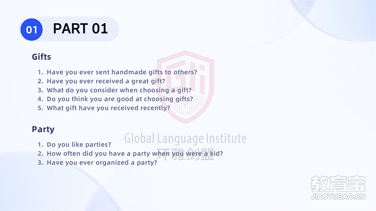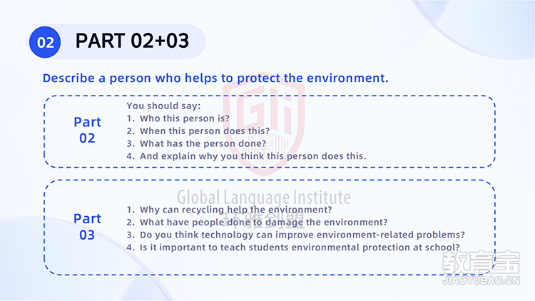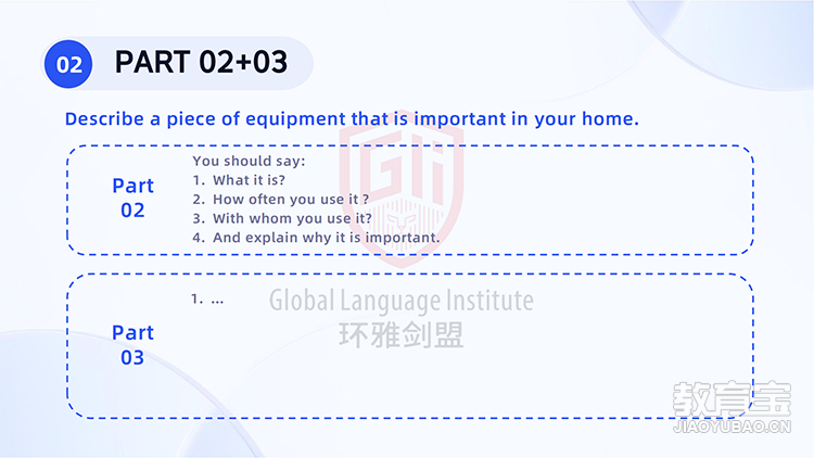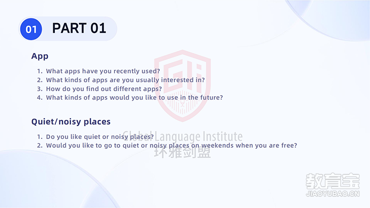 今天给大家送上雅思口语新题第二更内容!电子版的领取方式有以下两种:向课程顾问老师索要即可;在环雅剑盟GLI微信公众号后台留言“新题”亦可获得。
