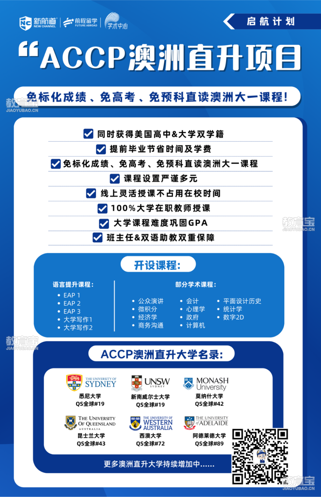 添加微信小助手16673165479,免费领取各国留学资料包2025QS榜单中,澳洲的学校仍然是大赢家。QS100的院校澳洲的院校占据了9所,前20院校3所,分别是墨尔本大学13,悉尼大学18,新南威尔士大学19。对于考虑本科去澳洲留学的小伙伴,如果A-Level出分不理想,是打算寻求不确定性,继续奋战晚1年入学,还是一定要去海外读预科呢?小编非常负责的告诉你,除此以外,还有第三种方案ACCP澳洲直通车,可以免预科直接进入澳洲八大,也就是直接进入全球前100。ACCP澳洲直通车项目ACCP澳洲直通车项目是美国高中双学分和大学通识课程为基础研发的澳洲学校直升项目。经考核通过加入项目的学生,完成ACCP课程,各项*考核合格,学分数量达标,免语言,免预科。……录取。项目核心亮点1世界百强院校录取2大学教授授课3免预科直升澳洲大一4美国高中&美国大学双学籍5课程设置严谨多元6班主任、双语助教,双重保障项目介绍项目入学要求01*单评估02ACCP项目方面试03雅思5.0以上同等水平或EAP英语内测40以上EAP语言分级测试说明
