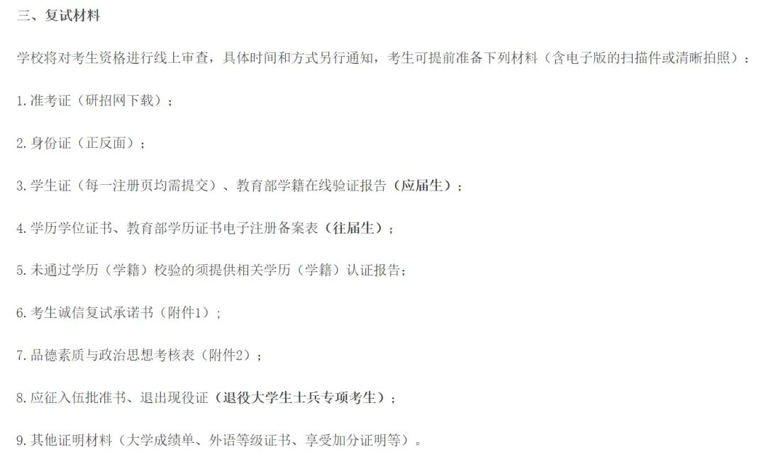 图源东北财经大学研招网①身份证明:初试准考证、本人有效身份证原件及复印件、毕业证书和学位证书(应届生带学生证)原件或复印件;②政治审核表:档案单位一般应与报名时填报的工作或学习单位一致且须加盖公章,该表需要在院校网站下载;③大学期间*单原件或档案中*单复印件,需加盖档案单位公章,在复试时单独交至各学院;④部分院校需要交纳复试费及带一寸彩色免冠照片;⑤加分证书:四、六级等相关证书,计算机等级证书、注册会计师证书等;⑥撰写材料:包括面试简历(5份左右)、自我介绍及给导师的信件等(可选项)。建议大家现在可以【打印*单并找学院加盖公章】、【润色简历】、【整理作品】、【准备导师推荐信】(一般导师推荐信都是由学生自己写好,再去请院里知名的老师签字推荐的,所以我们*好先自己拟好,再去征求老师意见,一定要注意礼貌!!!)不管目前情况如何,大家都要积极准备复试,重点关注调剂信息,不到最后一刻绝不能放弃!首先,对于基本能进复试的同学??01 完成专业课的复习很多学校复试都会有专业课的笔试,所以专业课一定不能抛弃!这场笔试非常重要,甚至能直接翻盘初试*。复试专业课的资料,有的院校会提供基本教材,而有的院校什么都没有,所以建议去问问该学校的学长学姐或者本科生,找一下他们的教材、期末重点甚至期末试卷。02 回顾其余核心专业课除了复习指定要考试的那一门科目外,专业上其他的核心课程也不能丢,这些都可能是面试时的提问点!比如初试考的那几门,如果没时间细看的话,也*好稍微再扫一下,尤其是其中的重难点。03 完成复试英语部分的学习复试中英语的考察,一般以听力和口语的形式呈现,个别院校会增加笔试。大家可以在备考之余,选择与自己专业相关的英文论文、期刊报道阅读。在熟悉本专业相关前沿研究的同时积累专业词汇。其次,练习模拟面试。可以找一位英语水平较好的朋友进行模拟面试。让他提问你一些常见的口语问题,并进行实际的口语回答。通过模拟面试,可以提高回答问题的流利度和准确性,同时也可以提高自信心。04 准备好自己的简历简历部分,样式不是最重要的,清晰整洁才是!对于自己的实习、竞赛、科研等经历,一定要展开细化,实在“三无”的同学,可以考虑写一些自己做过的实验或者大作业进去,同时也要具体展开。当然,大家也要注意,写在简历里的东西,一定要提前弄懂,如果老师能看到你的简历,那么这部分内容被提问的概率很大。05 联系心仪的导师毕竟考研*已经出来了,学校也都已经陆续开学,还是比较建议大家积极联系一下导师的,同时也*好向学长学姐了解清楚老师的为人,毕竟这也是你们对自己未来几年研究生生涯的负责。但是要注意,联系导师的邮件不要长篇赘述自己多么不容易、多么想读研,只要清晰的说清楚“自己是谁、为什么选择这位导师、未来规划”就可以。06 准备好自我介绍这个不用现在就准备,可以等到简历基本完成的时候,自我介绍也就顺理成章的出来了。毕竟是自己简历的内容,大家也不需要刻意背诵,多读几遍梳理好逻辑就可以。07 准备一些面试的问题在复试的前1-2天,大家可以稍微花点时间,准备一下复试中相对高频的问题。比如:为什么要报考我们专业、读研规划这种。当然一定要注意不要用客话、套话回答,而是结合自身,形成个性化的回答。对于擦线的同学,小翼还是建议以一志愿复试为主。无论是一志愿还是调剂,复试内容不会差太多,离分数线公布、调剂系统开放也还有一定时间,大家千万别闲着!那么对于在一志愿过线边缘徘徊的同学们,建议:能调剂就调剂,能走一定走!那么3月,对于铁定要调剂的同学,可以考虑这么三件事??1.培养搜集调剂信息的能力;一志愿相近的专业,专业课差不多或者相同,会让我们复试准备起来容易很多;如果要跨专业调剂,那尽量选择几所复试科目一致或者相似的院校,千万别东一榔头西一棒锤;2.如果已经有比较合适的调剂院校,可以先照着去年的考察内容去复习,时刻关注调剂动态;3.可以适当去联系一下导师,有些调剂名额可能是由老师直接掌控的,会优先确定好大致人选,大家可以积极尝试一下,尤其是对于那些往年一直都有调剂名额的专业。另外,今年复试都会以线下方式,但调剂很有可能会采用线上形势!线上更考验一个人的整体水平,也考验大家的心态,所以更是建议大家提早复习好相应的考察内容,以免到时候手忙脚乱的。?往期推荐?