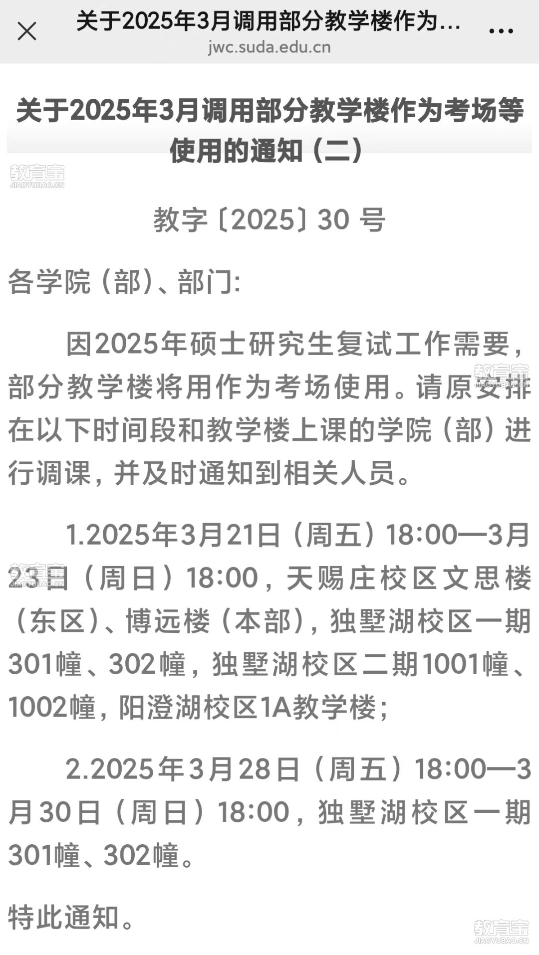 考研资讯小伙伴们早上、中午、下午、晚上、凌晨好啊~国家线一公布,大家的心瞬间提到了嗓子眼,复试线、复试时间更是成了每天必刷的“热点”,简直比追剧还上心。好在,复试时间终于有了眉目。??????苏州大学教务处那边已经发布了通知,要调用教学楼作为考场,看来复试时间基本锁定在3月21-23日了。(图源:苏...
