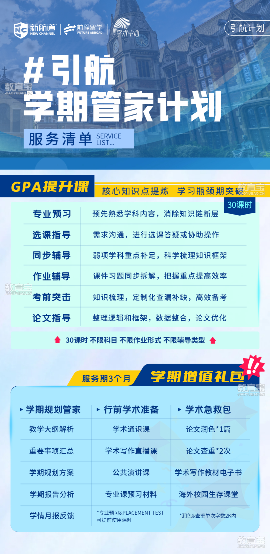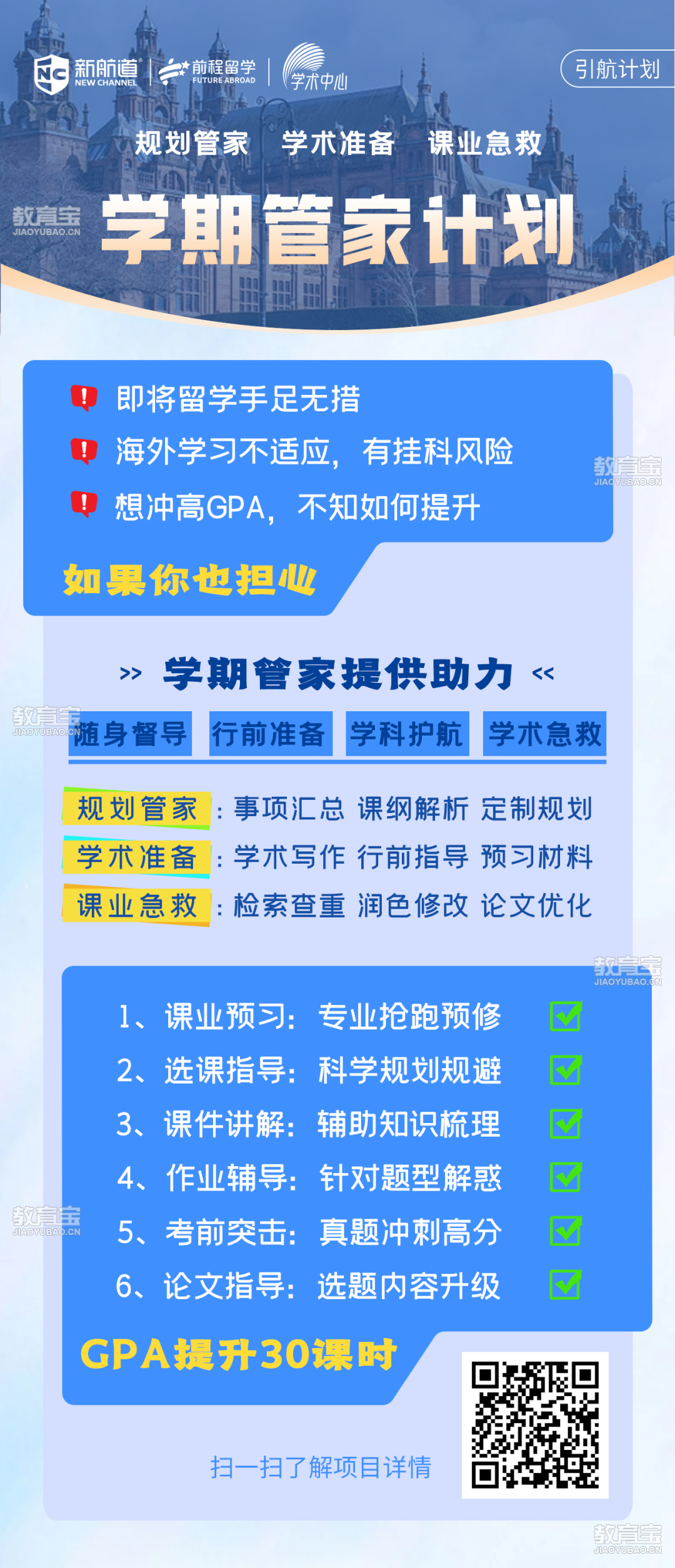 很多留学生对职业缺乏提前规划的意识。据统计,有超过1/3的毕业生会因为GPA不够优秀、简历不出众以及缺乏竞争力等原因面临而就业挑战。这两大难题*严重的后果就会导致GPA过低。1GPA过低的后果具体表现:无法申请自己心仪的高校/无法申请转专业没有保研和申读双学位的资格无法顺利毕业/影响就业严重会被开除取消签证,失去留学生身份针对以上问题,我们的准留学生也别担心,新航道海外学术辅导管家计划,帮您在学术道路上一路护航,帮助你更好提升学术能力。提前在国内可以早做课程的预习,选课指导等。