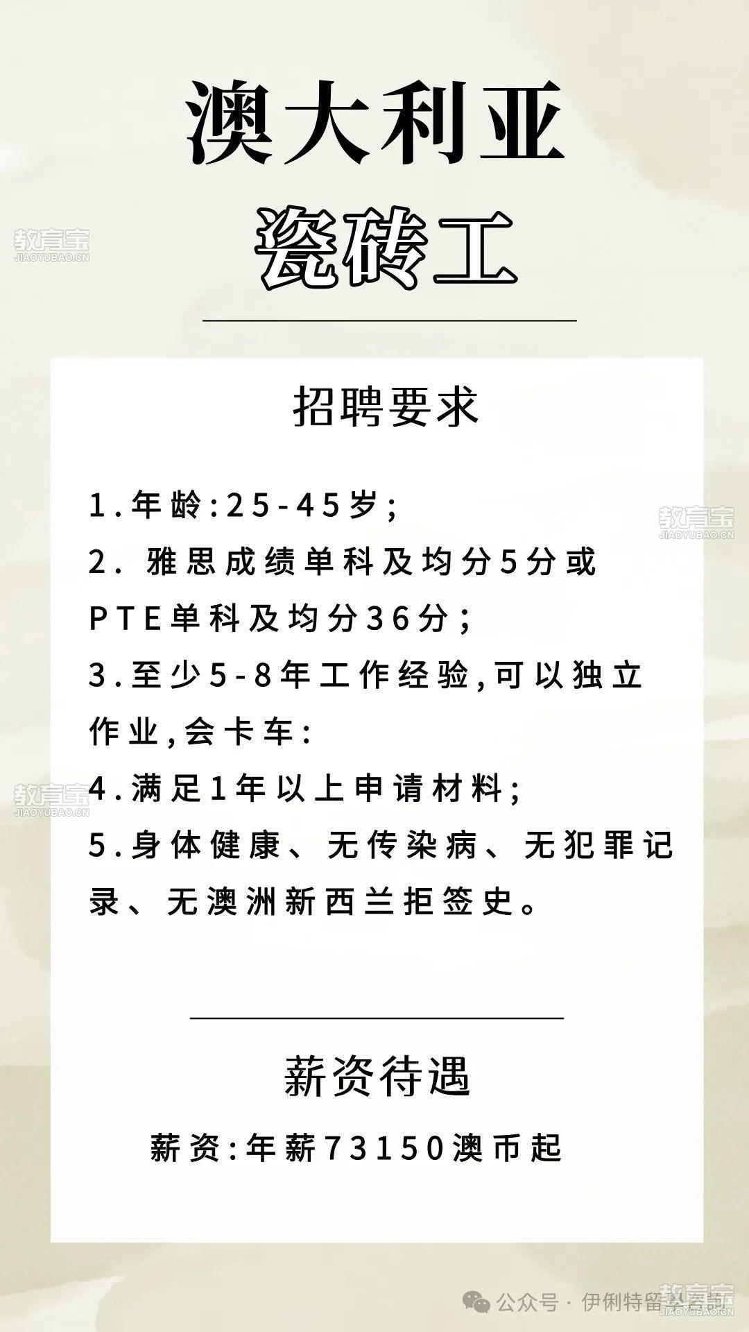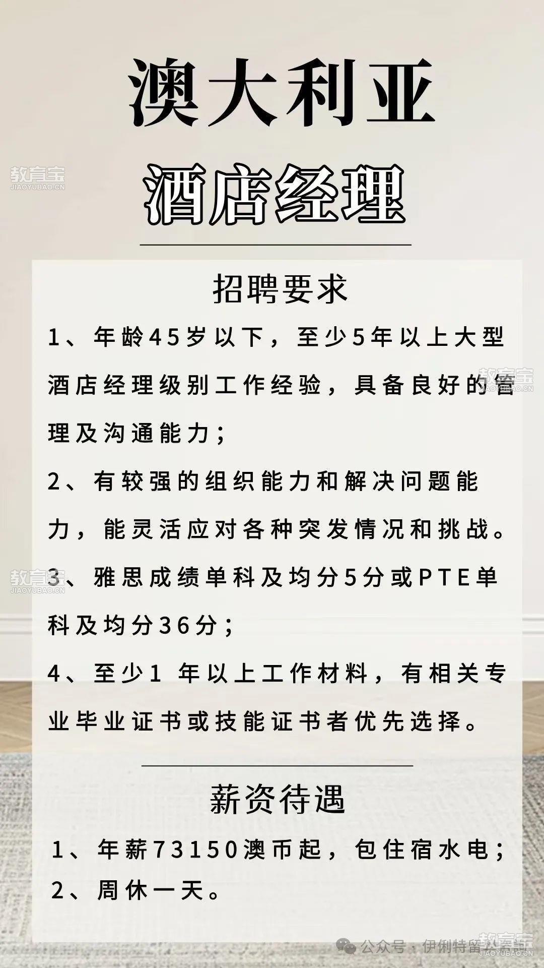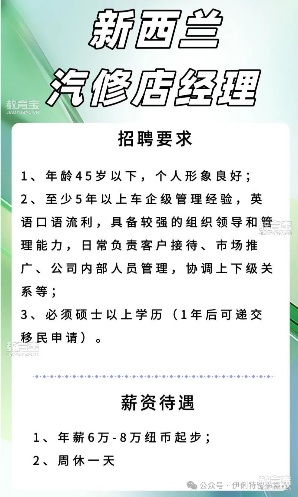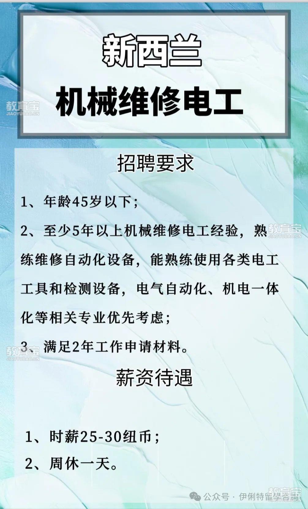 ??有兴趣的同学们请注意以下几点:1.澳洲(subclass482SID)工作签都需要IELTS至少四个5分,能拿出至少一年社保或者工资单2.新西兰工作签的三级职业岗位无需英语*,四级五级则需要英语*。根据雇主Job check要求,需要至少两年工作经验 或 本科以及以上学历。想换个大环境而且有兴趣赚澳币和纽币的同学可以联系我们进行咨询。伊俐特移民工作留学咨询也提供:-海外工作招聘,澳洲工作签和移民签证以及留学服务。有兴趣的同学们可通过以下联系方式联系我们。微信号:eecgroup