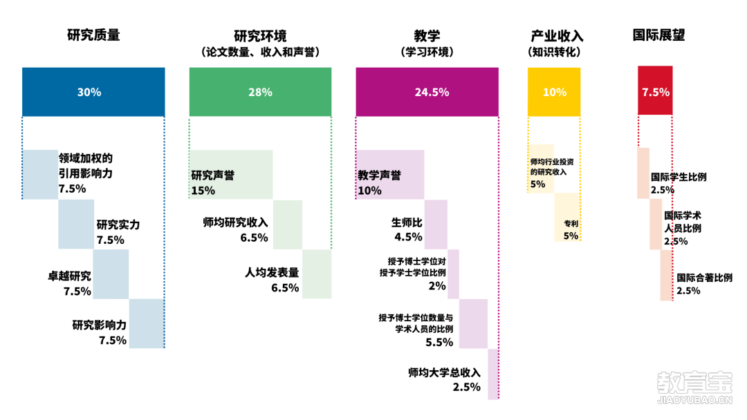 一、排名方法泰晤士亚洲大学排名使用与世界大学相同的18个经仔细校准的绩效指标,以提供*全面而平衡的比较,同时,亚洲大学排名的权重经过专门调整,以准确反映亚洲大学的优先事项。其绩效指标可分为5个领域,分别是:· 教学(学习环境):24.5%· 研究环境(论文数量、收入和声誉):28%· 研究质量:30%· 国际展望:7.5%· 产业收入(知识转移):10%