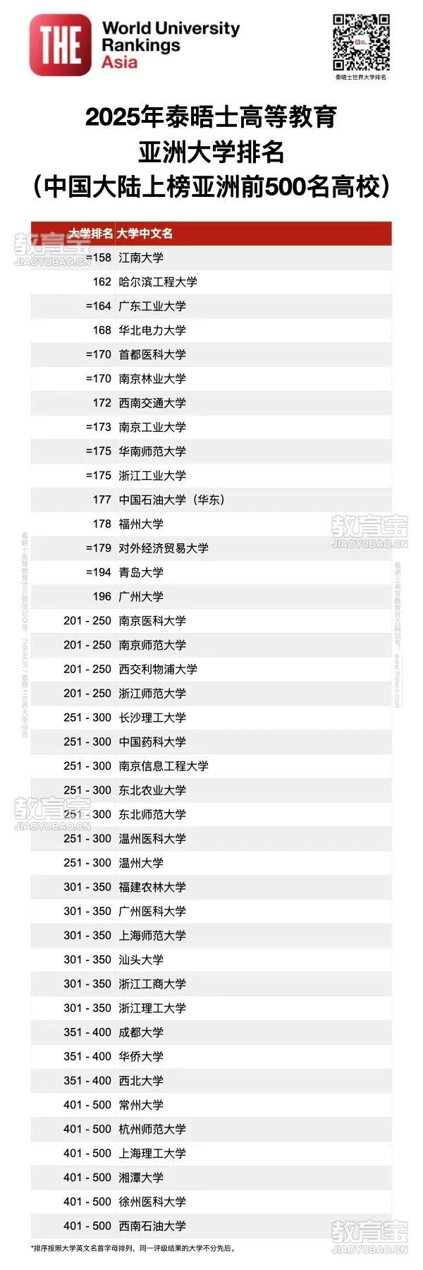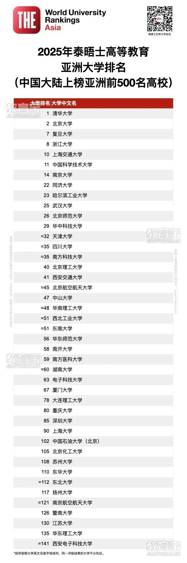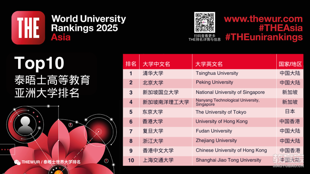 二、排名亮点· 中国大陆高校领跑亚洲大学排名,在Top 3中,清华大学连续七年荣获亚洲第1,蝉联亚洲大学排名榜首;北京大学再次蝉联亚洲第2;· 来自新加坡的新加坡国立大学蝉联亚洲排名第3。· 与2024年的排名相比,前十名的高校变化不大。