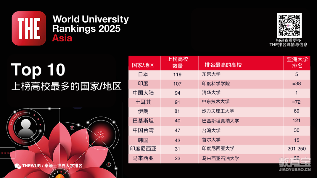 · 本次排名中,日本是上榜院校*多的国家/地区,共有119所高校上榜。其次是印度(107所)和中国大陆(94所)。乌兹别克斯坦、巴林、蒙古和叙利亚是今年新上榜的国家/地区。