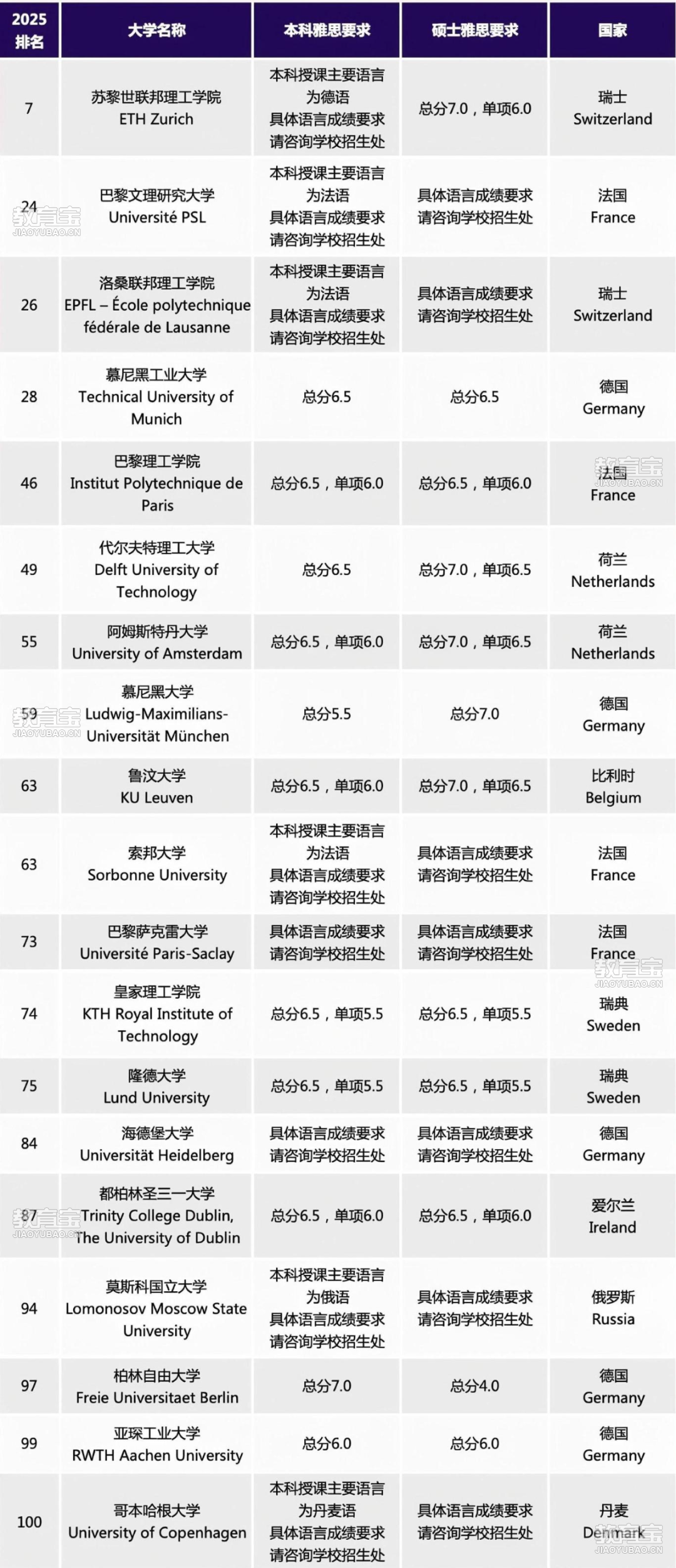 05 欧洲院校雅思*同样能申请欧洲很多世界学校,还是法国、德国、荷兰等欧洲多国院校英语授课项目认可的语言*,如果考鸭打算去欧洲留学,下面这份欧洲梦校雅思要求记得收好!