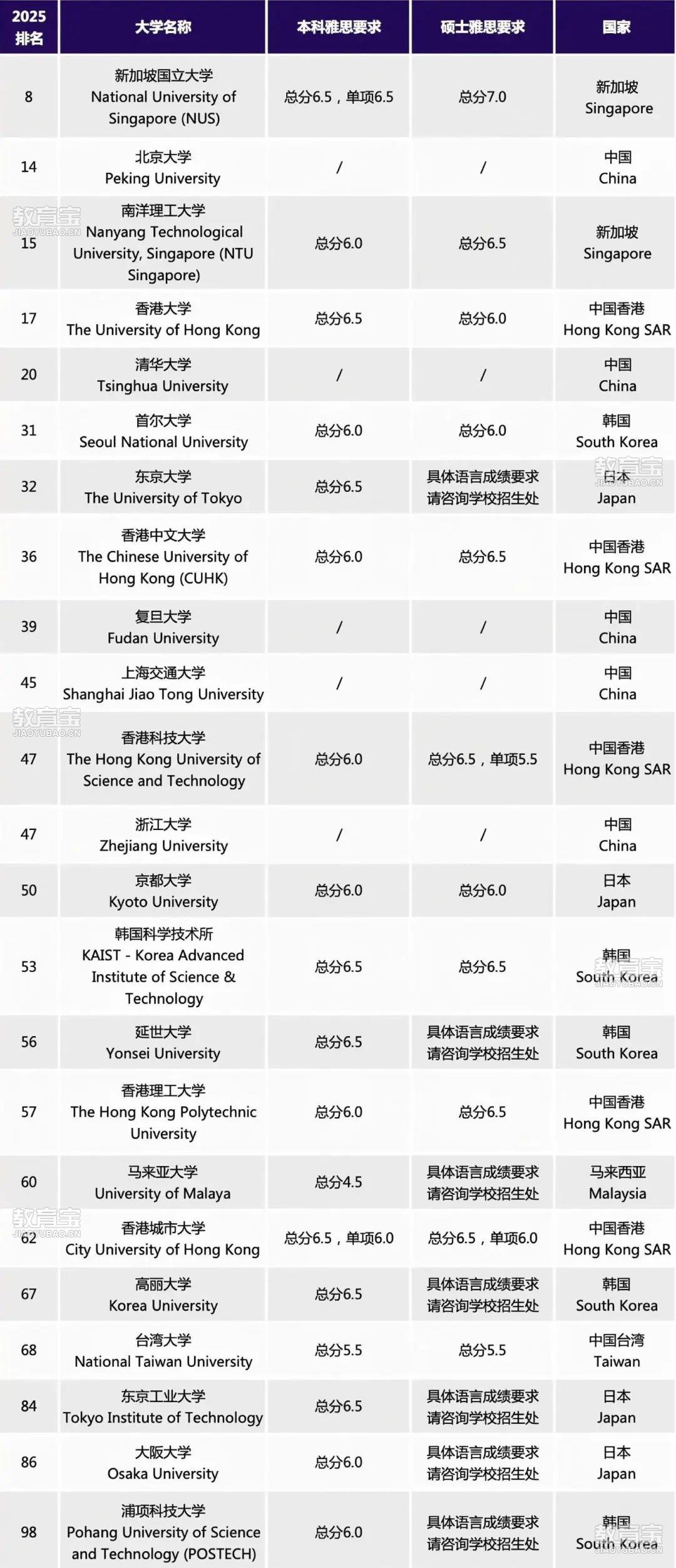 06 亚洲院校如果你不想离家太远,也有许多亚洲国家和地区的世界学校可供选择。亚洲主要留学目的地国家和地区都广泛认可雅思,其中中国香港和新加坡高等院校认可雅思*。