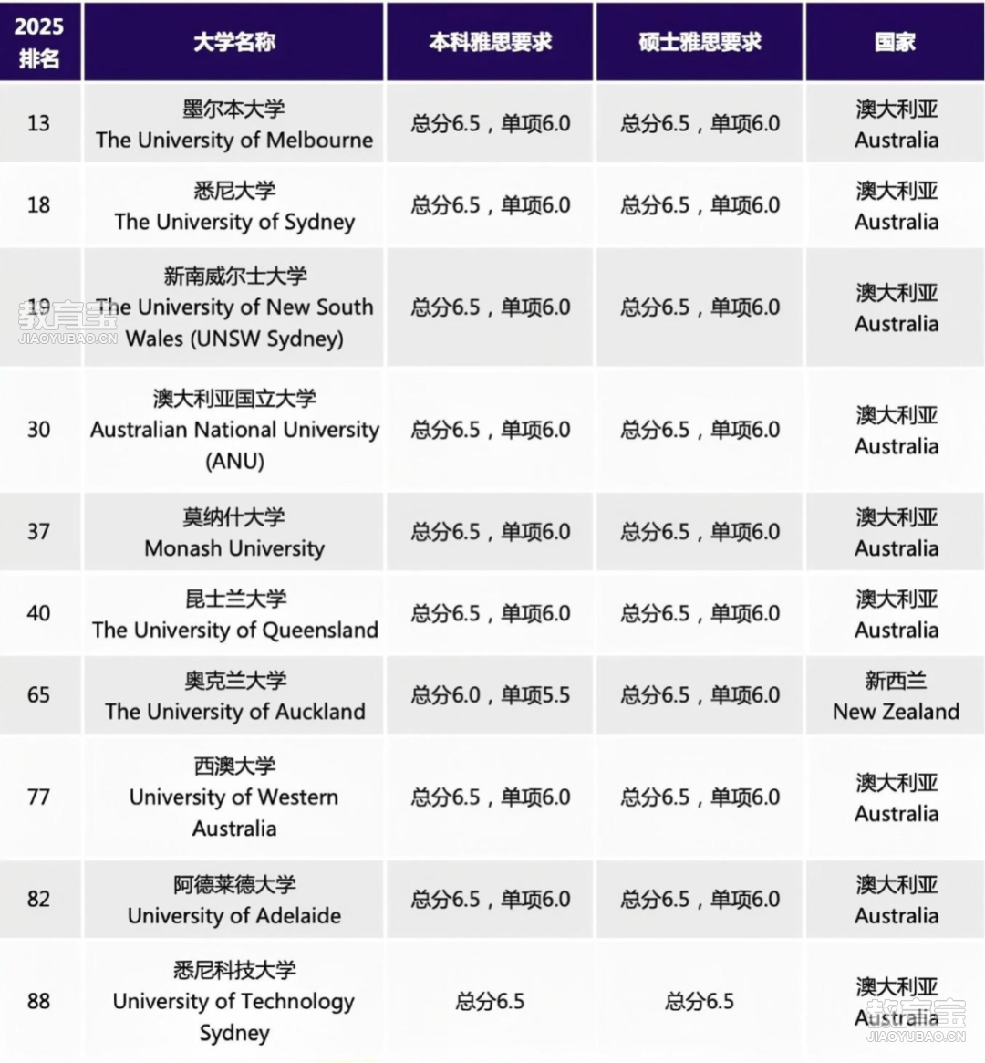 04 澳大利亚和新西兰澳大利亚和新西兰的高等院校及专业协会对雅思的认可度极高,一般来说,赴澳洲读本科需要雅思总分不低于6.5分,单项不低于6.0分。
