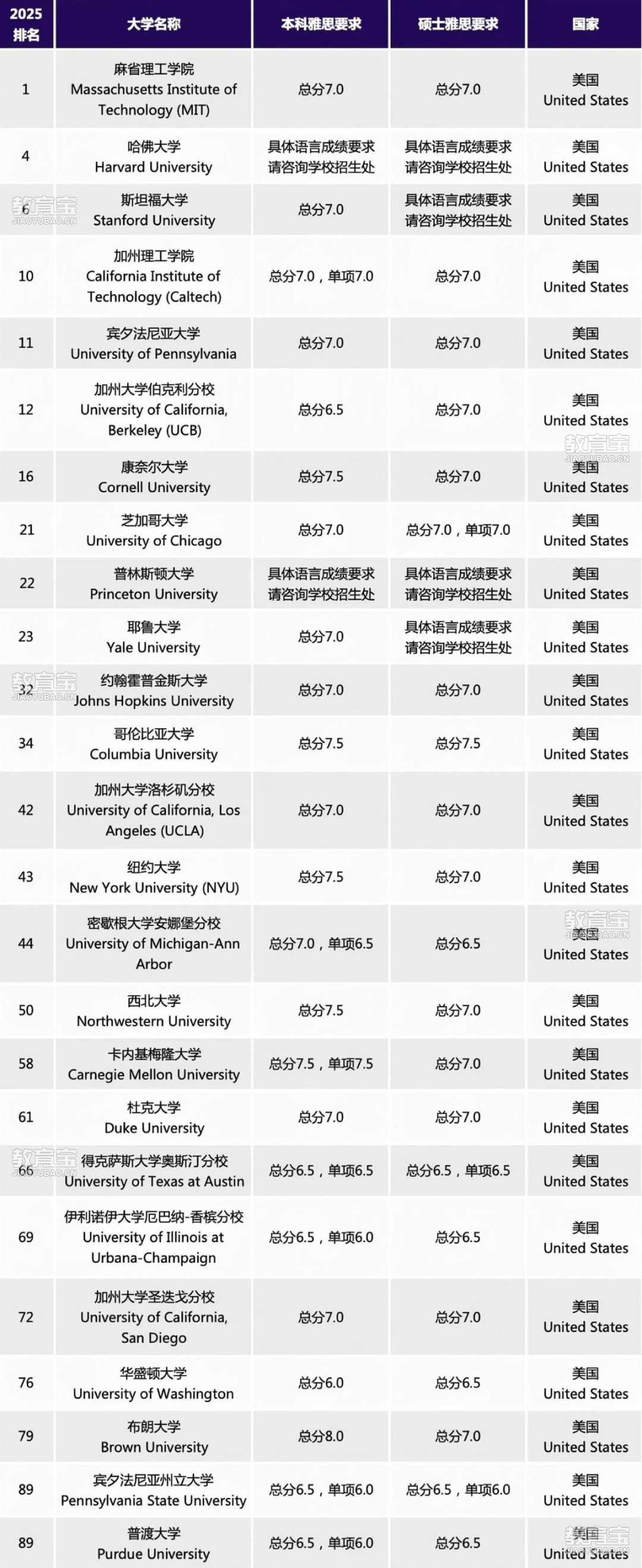 02 美国美国拥有顶级的国际教育标准,如果你的梦校在美国,通过考雅思,你可以申请美国的大学或者学院,雅思已被绝大多数(超过3,400所)美国院校认可,包括所有常春藤盟校。部分美国学校(例如麻省理工学院的研究生课程)明确表示,更倾向于或只接受雅思*。一般来说,美国TOP院校对雅思的分数平均要求为6.5-7.0分以上。