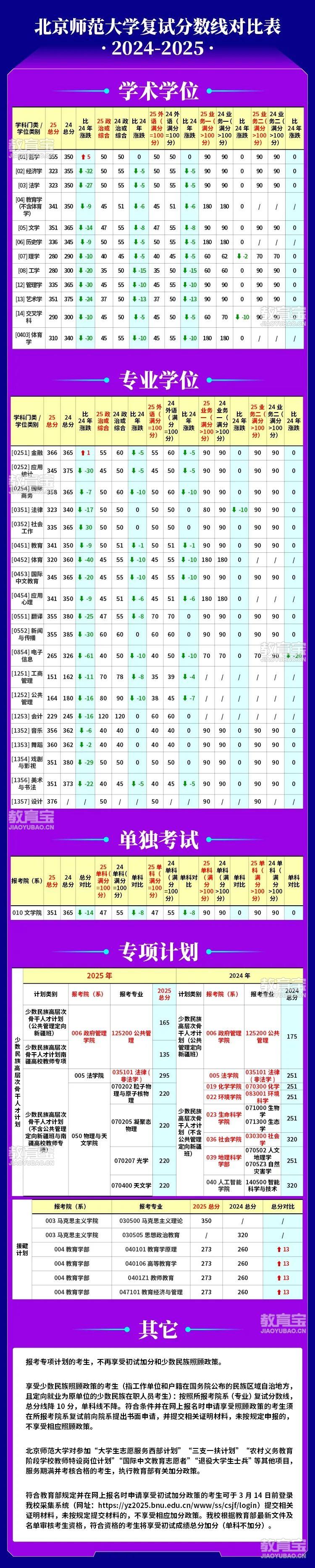 北京师范大学考研复试分数线对比表(2025、2024)