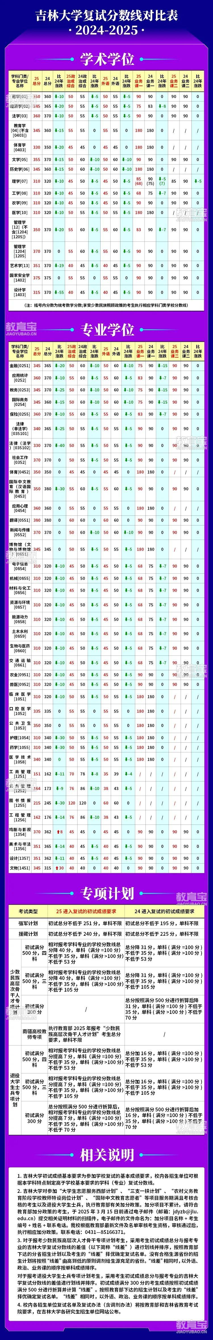 吉林大学考研复试分数线对比表(2025、2024)