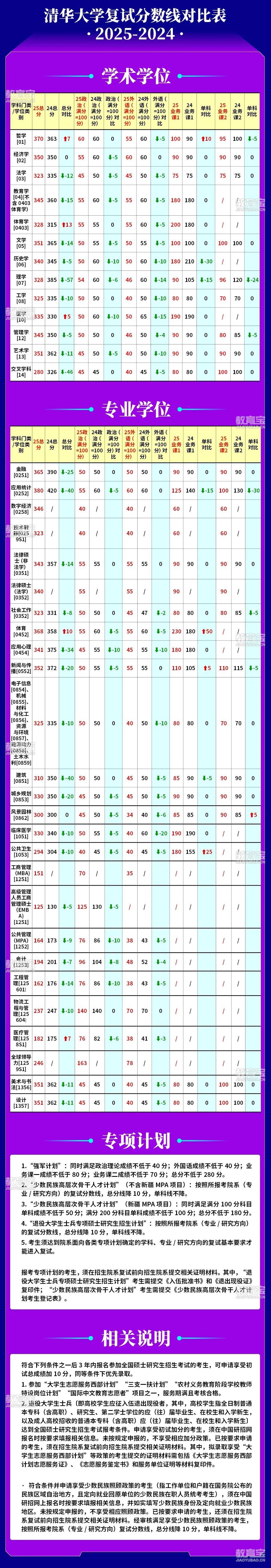 清华大学考研复试分数线对比表(2025、2024))