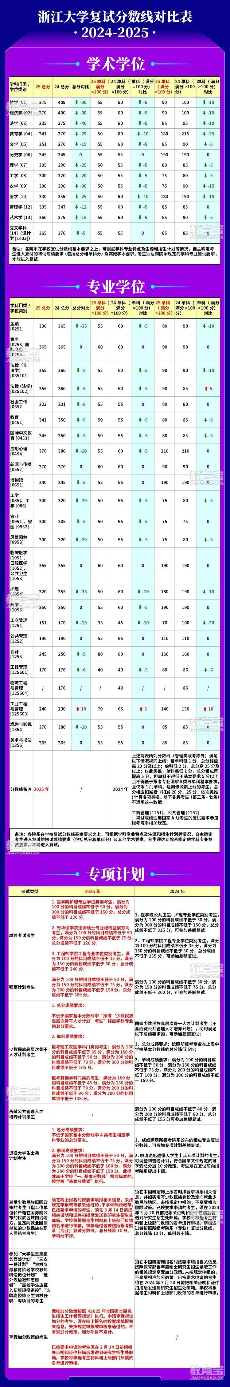 浙江大学考研复试分数线对比表(2025、2024)