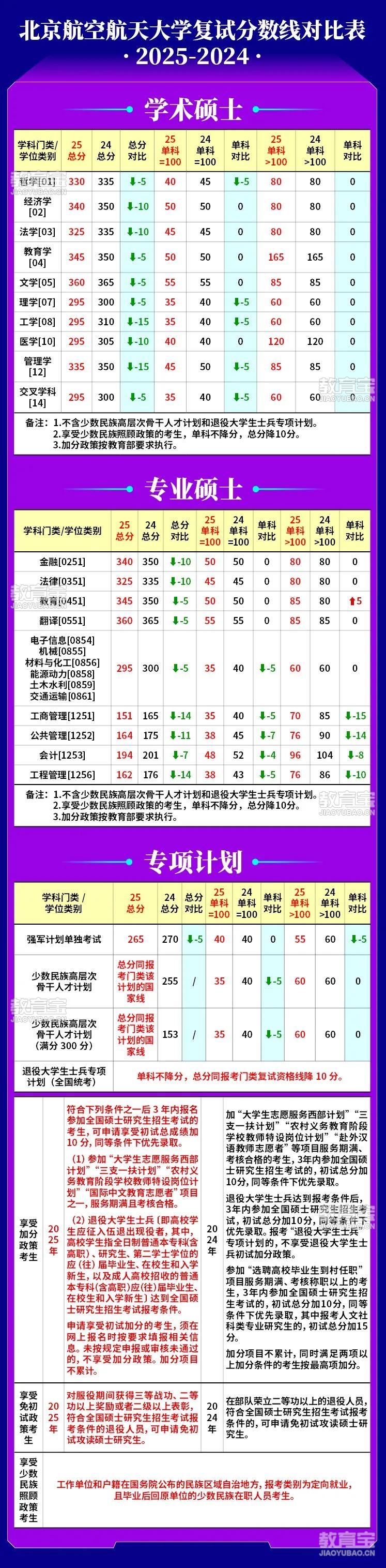 北京航空航天大学考研复试分数线对比表(2025、2024)