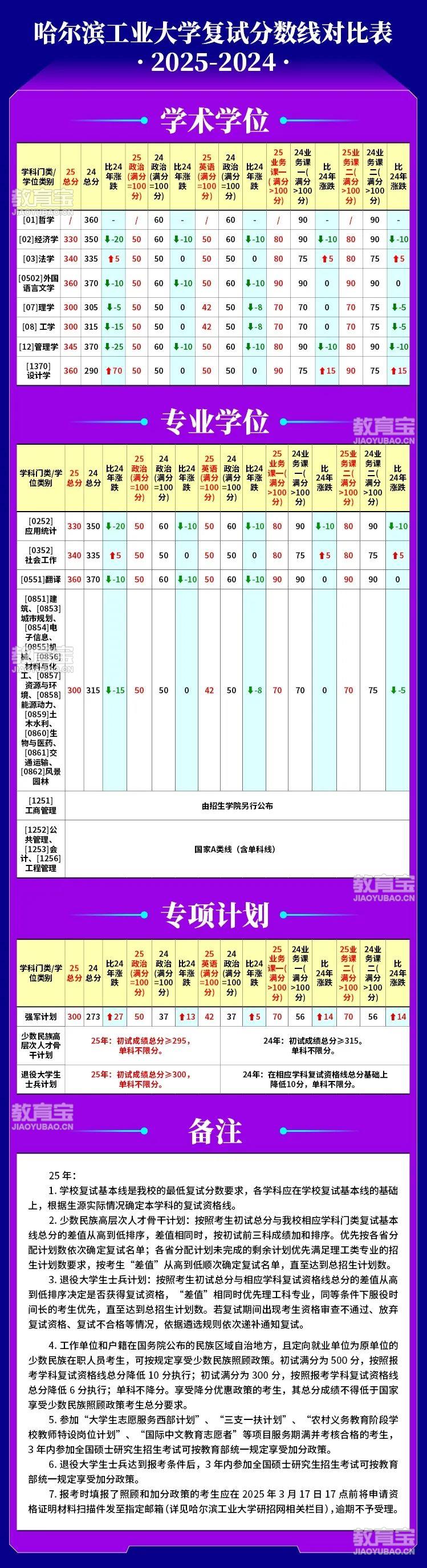 哈尔滨工业大学考研复试分数线对比表(2025、2024)
