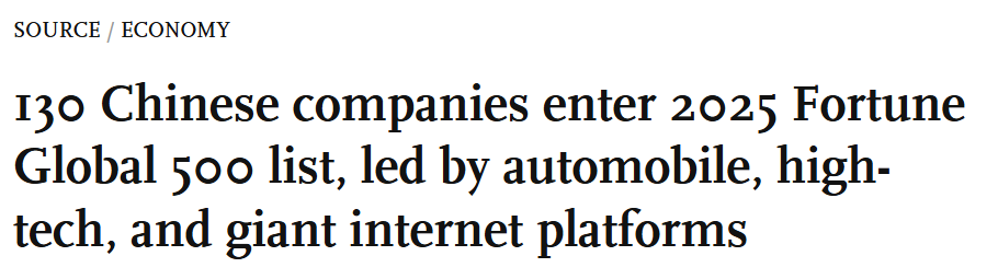 下面我们一起来看《Global Times》的这篇报道,标题是:130 Chinese companies enter 2025 Fortune Global 500 list, led by automobile, high-tech, and giant internet platforms。翻译成中文就是:2025年《财富》世界500强榜单中共有130家中国企业上榜,其中以汽车、高科技和大型互联网平台表现*为亮眼。