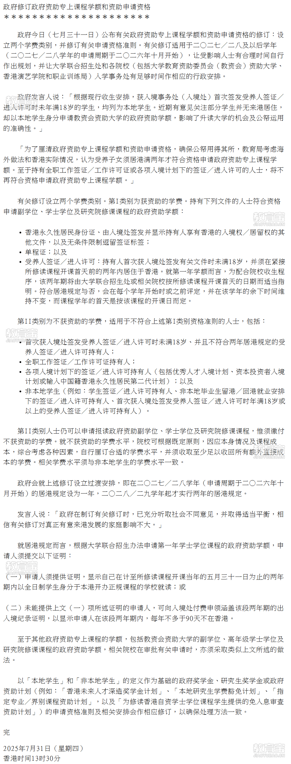 一句话——“考试移民”,凉了近年来,随着香港教育优势的凸显,不少内地家长采取"考试移民"策略,通过申请香港人才计划(如优才、高才通、专才等)为子女获取香港身份,使其能以"本地生"资格享受香港高校的低学费录取优势,同时避免真正在港长期居住。香港教育局昨日(7月31日)宣布重要政策调整,修订"本地生"定义,对低成本“考试移民”造成重大影响!政策详情如何?什么时候实施?接下来给大家详细剖析。原文如下: