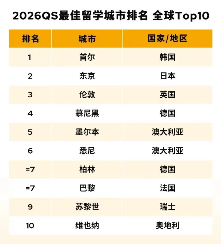 首尔2026QS全球*佳留学城市排名公布*佳城市重磅消息!7月15日,国际高等教育研究机构QS正式发布了2026年*佳留学城市排名。一句话总结:首尔=学校多+花钱少+工作好找+生活爽,2026年留学闭眼冲就对了!??