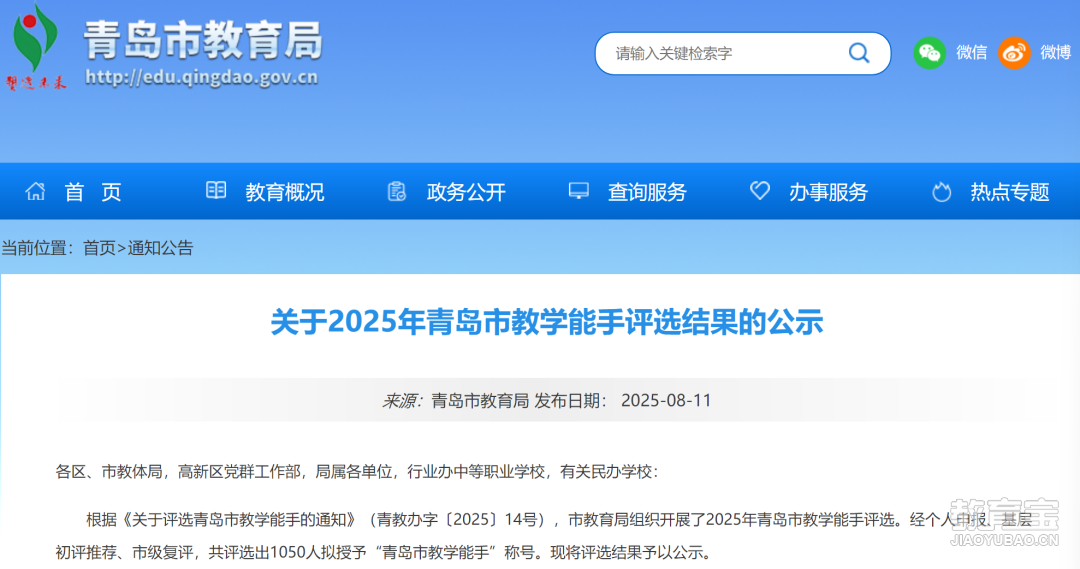 8月11日,青岛市教育局官网公示了2025年青岛市教学能手评选结果。经个人申报、基层初评推荐、市级复评,共评选出1050人拟授予“青岛市教学能手”称号。公示时间:2025年8月11日至15日。
