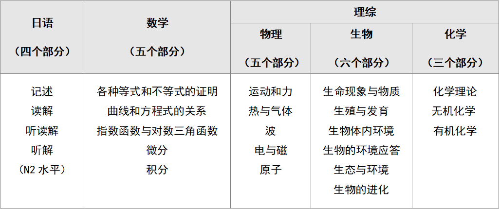 日语、文/理数、文/理综均有3 EJU的考试内容 EJU考试总分是800分+记述50分,分为文科和理科。同学先根据自身情况,目标专业选择自己要参加的文科考试或者理科考试。文科:日语(400分+记述50分)+)+文综(历史、)理科:日语(400分+记述50分)+)+理综()P.S.沪江小科普:文科专业:文学,教育学,法学,经济学,经营学,商学,社会学,国际关系,人间科学等。理科专业:工学,理学,农学,药学,医学,建筑学,机械,生命科学等。下面是EJU考试考察的具体知识板块。文科
