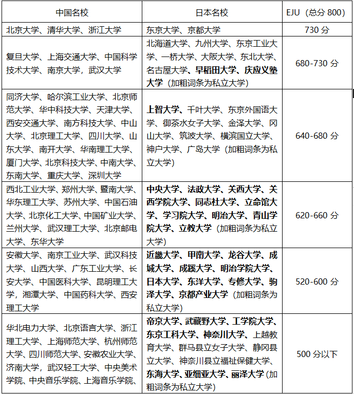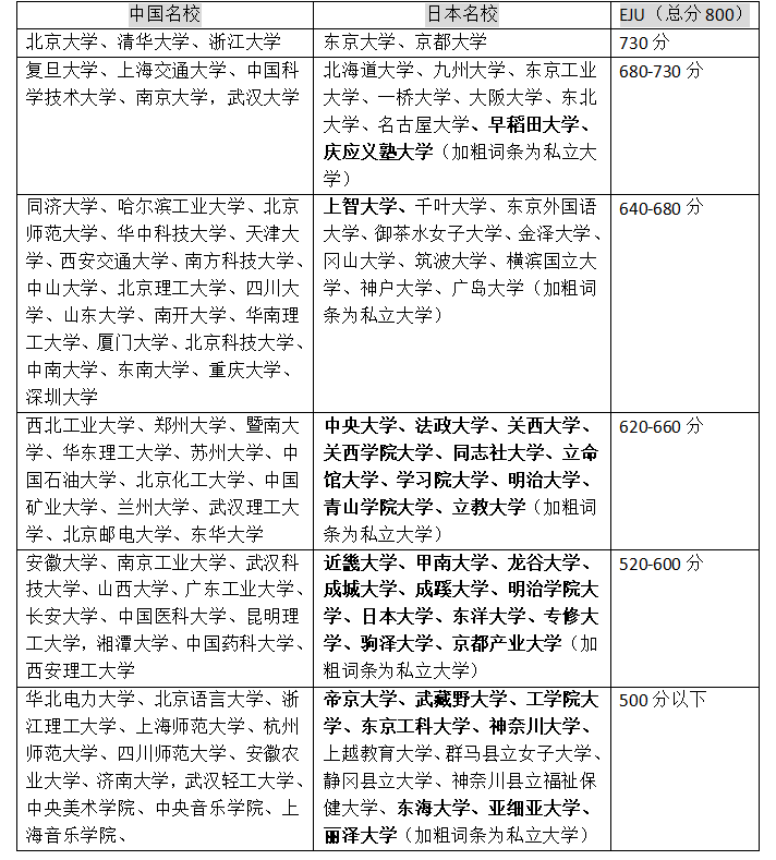 日语、文/理数、文/理综均有6 日本大学EJU分数所能报大学与中国大学对比