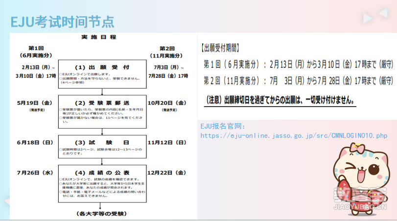国内高考越来越卷,近期已经有不少高一、高二的学生家长,来咨询我们赴日读大学,博一次学校机会!赴日考大学的话,除了日语*,很重要的一门考试*就是EJU。但大家可能对EJU考试是什么一知半解,只知道去日本的读大学需要EJU考试的*,并不清楚EJU的相关情况。那么本篇文章将从以下6个方面为同学们进行全面解答。1 什么是EJU2 怎么报名EJU3 EJU需要哪些考试内容4 如何准备EJU考试5 常见问答6 日本大学EJU分数要求1 什么是EJU EJU简介:中文名称是日本留学考试,中文简称留考,英文简称EJU,是用来测验外国留学生的日语和基础的学力(学力指的是学习能力)考试。