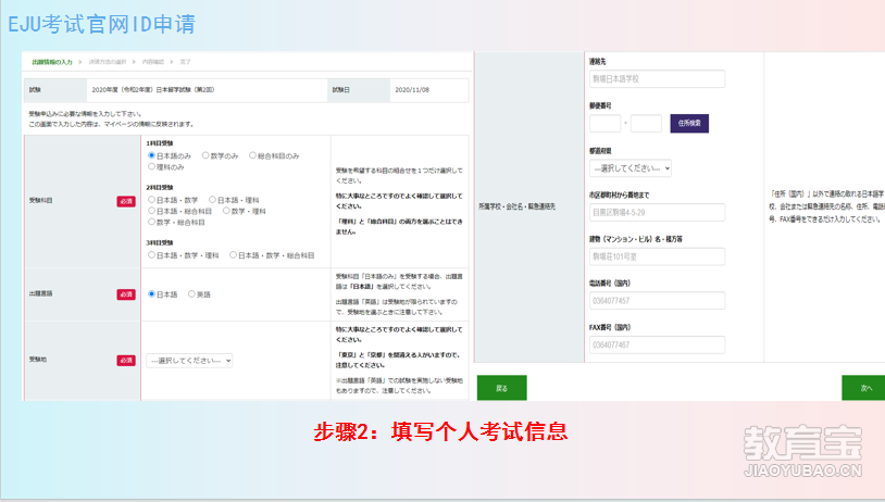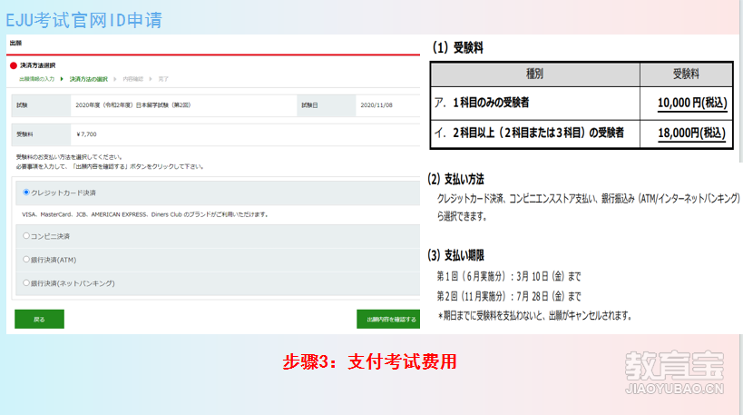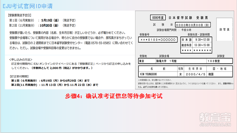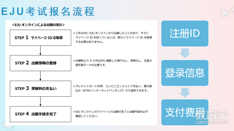 日语、文/理数、文/理综均有2 怎么报名EJU 报名条件外国留学生想考日本大学的话,需要年满18周岁,并在日本以外的国家完成12年的学校教育。报名流程(以日本国内为例)1. 网上填写资料:https://EJU-online.jasso.go.jp/src/CMNLOGIN010.php2. 支付报名费:可用信用卡在线支付/日本便利店支付/日本银行汇款3. 准考证配送:仅限日本国内住所亚洲考场:日本、香港、台北、韩国、新加坡、马来西亚、泰国、菲律宾。考试费用:单科10000日元、2科及以上18000日元