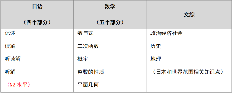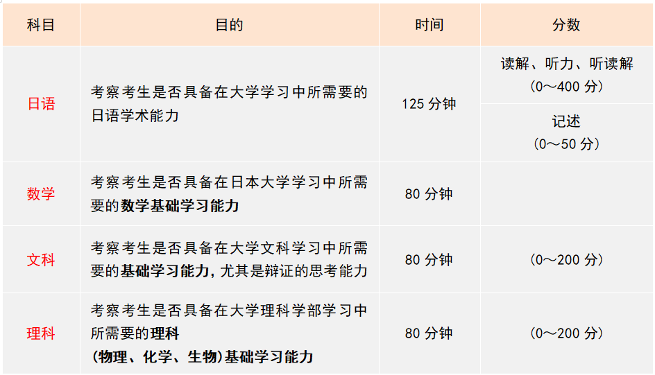 可能大家会有疑惑这总分加起来不是850分吗?是因为很多学校他会要求你单科的分数,日语中的读解、听力、听读解(~400分)+记述50分的总分在多少分以上。比如大阪大学文学部针对留学生的选拔要求是日语+记述一共300分以上即可,理学部要求学生的记述分数单项大于25分。如果达不到这个要求的就没有报考资格。注:记述的考查内容:针对一种或多种思考方式的个人意见论述,关于某个问题的现状说明,论述一下将来的预测以及解决方法。(记述难度系数不高,如果有写日语作文的训练,基础语法不出错,25分可以轻松拿。)EJU备考课程、备考方案咨询??
