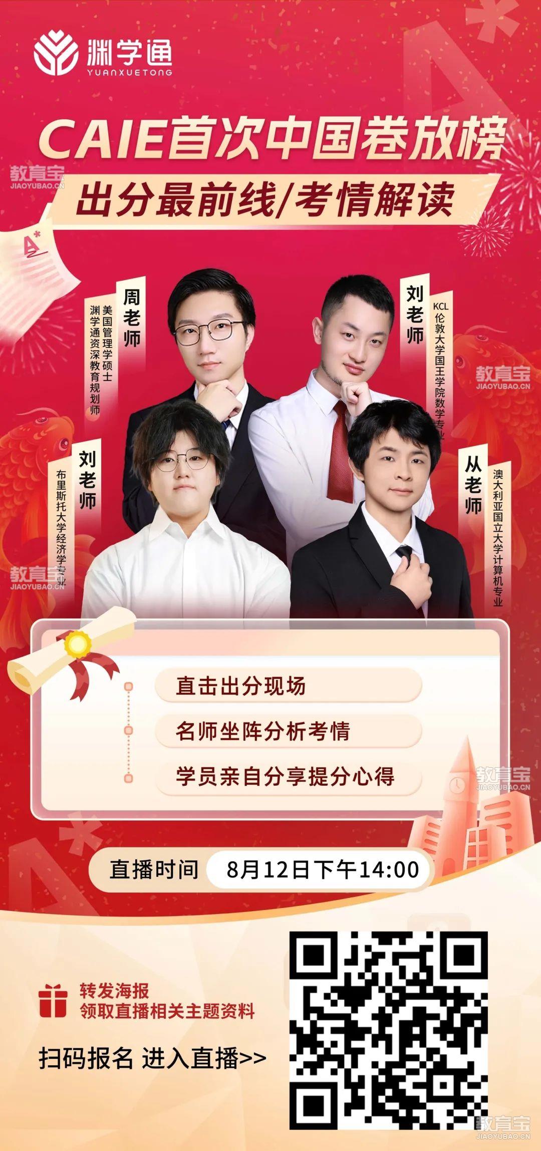 8月12日下午2点——就是明天,锁定渊学通“CAIE中国卷放榜——出分*前线/考情解读”直播,带你高效应对*困惑↓直击出分现场第一时间了解本次CAIE中国卷出分整体情况,把握分数分布、通过*等关键数据。老师深度考情分析周老师(美国管理学硕士、渊学通资深教育规划师 )、刘老师(KCL伦敦大学国王学院数学专业等背景老师 )坐镇,剖析试卷难度、题型变化,拆解分数 “意外” 根源,明确考试趋势。学员心得分享优秀学员现身,分享备考技巧、策略,从真实经历里找可借鉴的学习方法。参与方式超简单扫码报名即可预约直播!