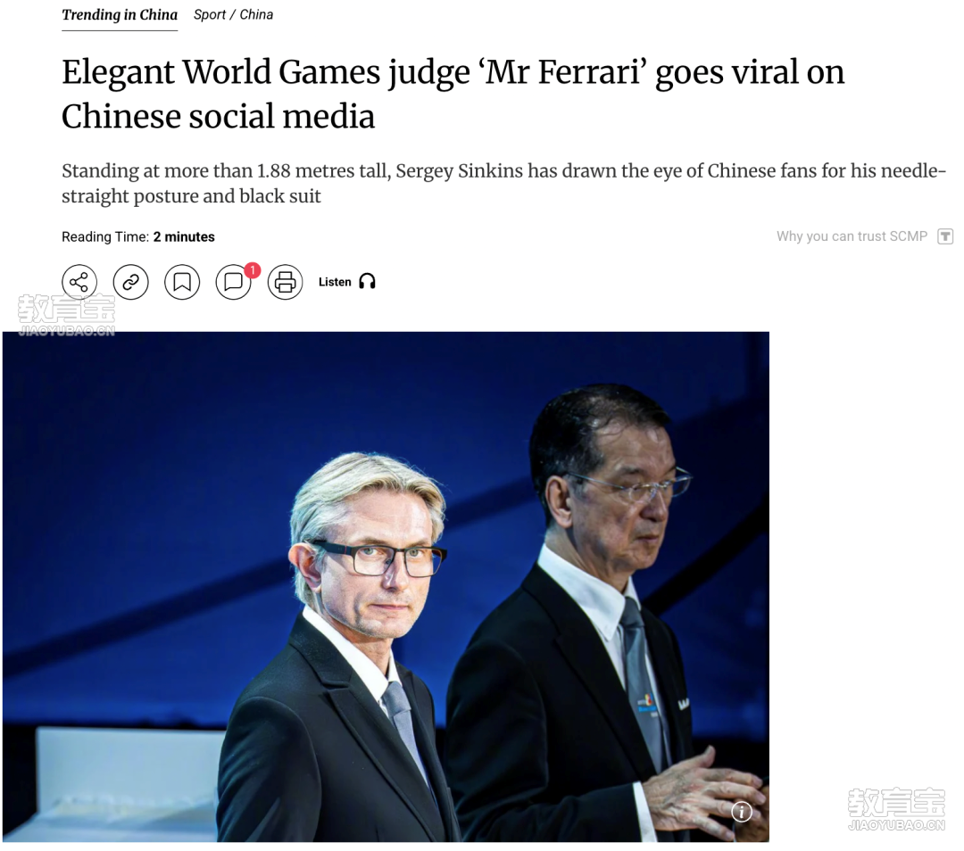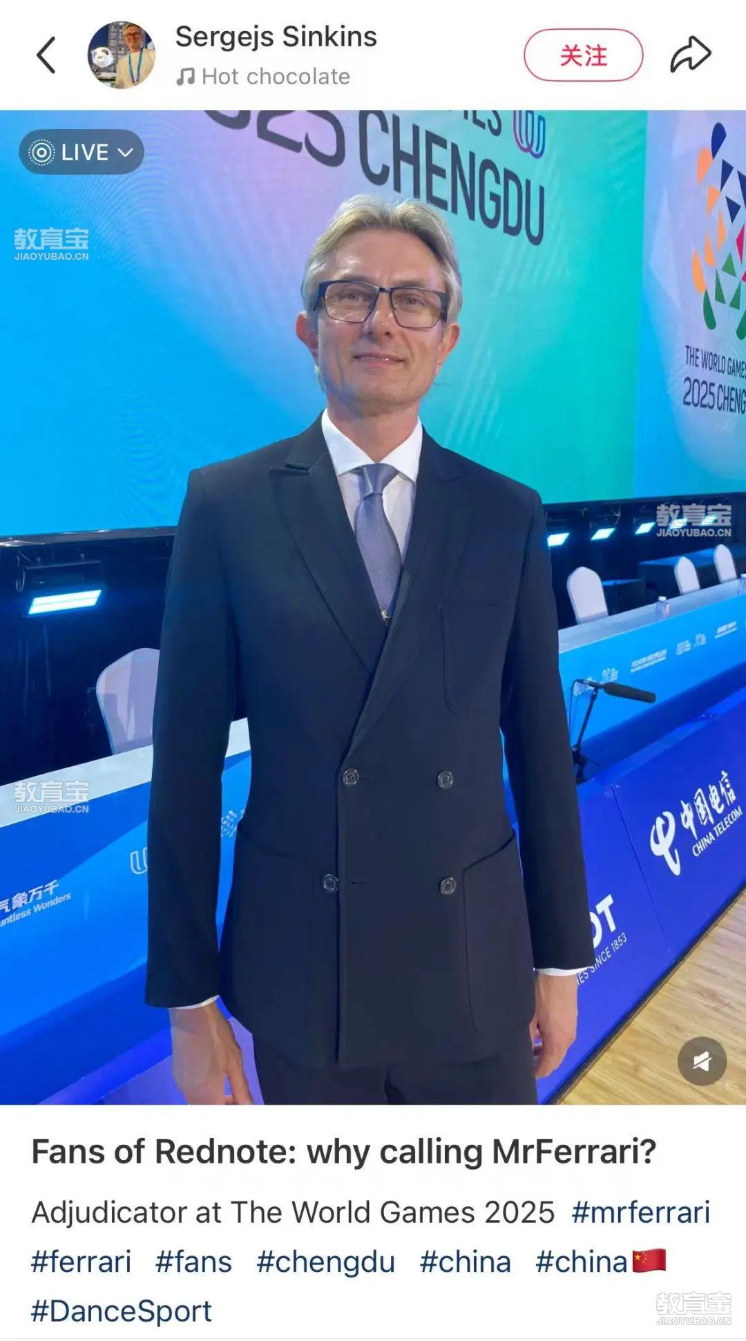 A Latvian judge in the Latin dance contest at the World Games in Chengdu has gone viral on Chinese social media, with fans commenting on his posture and elegance, which have earned him the nickname “Mr Ferrari”.在成都举行的世界运动会拉丁舞比赛中,一位拉脱维亚评委在中国社交媒体上意外走红。网友纷纷评论他的仪态和优雅气质,并给他取了个绰号——“法拉利先生”。Standing at more than 1.88 metres (six feet, two inches), Sergey Sinkins, listed as an official adjudicator at the World Games, drew the eye of Chinese fans at the Chengbei Gymnasium on Friday for his tall and slender appearance, needle-straight posture, silver hair and black suit.这位名叫谢尔盖·辛金斯的评委,是世界运动会的官方裁判之一,身高超过1.88米,周五在城北体育馆亮相时,以修长的身形、笔挺的站姿、银白的头发和一身黑色西装吸引了中国观众的目光。