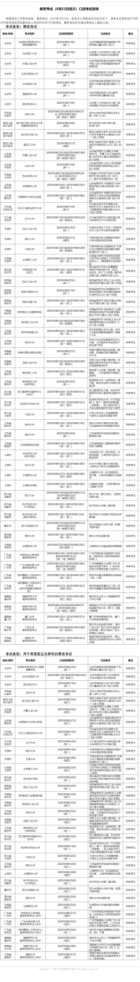 雅思考试(8月23日场次)口语考试安排根据考试工作有关安排,雅思考试(2025年8月23日)各考点口语考试时间区间如下。请考生在准考证打印时间内登录报名网站查询本人考试时间并打印准考证,最终考试时间请以准考证上通知为准。