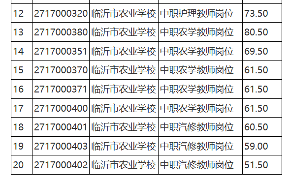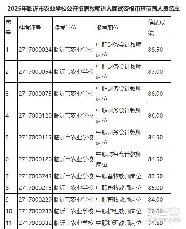 根据《2025年临沂市农业学校公开招聘教师公告》规定,经县事业单位招聘主管机关研究同意,确定2025年临沂市农业学校公开招聘教师笔试合格分数线为50分。在笔试合格分数线以上(含),按照笔试*和规定的比例,由高分到低分确定了各招聘岗位进入面试资格审查范围的人员名单,现予...
