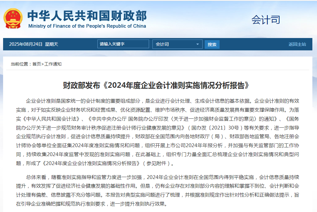 点击蓝字,关注我们)仁财会计会计人们注意啦!2025年7月23日,财政部发布了一则重磅消息——《2024年度企业会计准则实施情况分析报告》。这可不是一份普通的报告,它与我们日常工作息息相关,直接影响到企业财务处理和财务人员实操,绝对值得所有会计人认真研读。