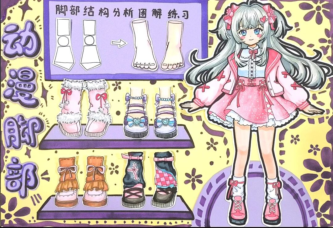 课时安排2-3课时动漫脚部、鞋子结构练习掌握脚部与鞋子的结构关系及绘制技巧。先讲解脚部基本骨骼、肌肉结构以及常见动态下脚部的形态变化,以此为基础引入鞋子的绘制,包括不同类型鞋子(如运动鞋、皮鞋、靴子等)的造型特点、比例结构;接着通过示范与练习,教导学员如何根据脚部动态和整体画面风格,运用线条和色彩表现鞋子的立体感、质感和光影效果。