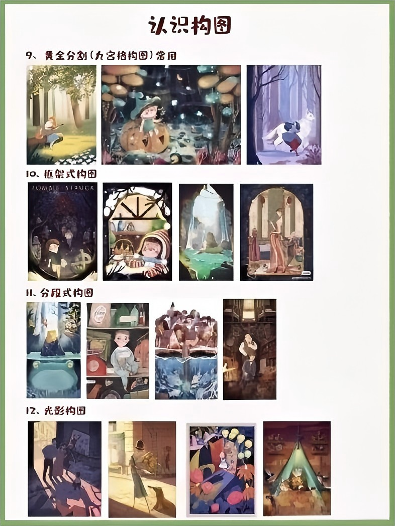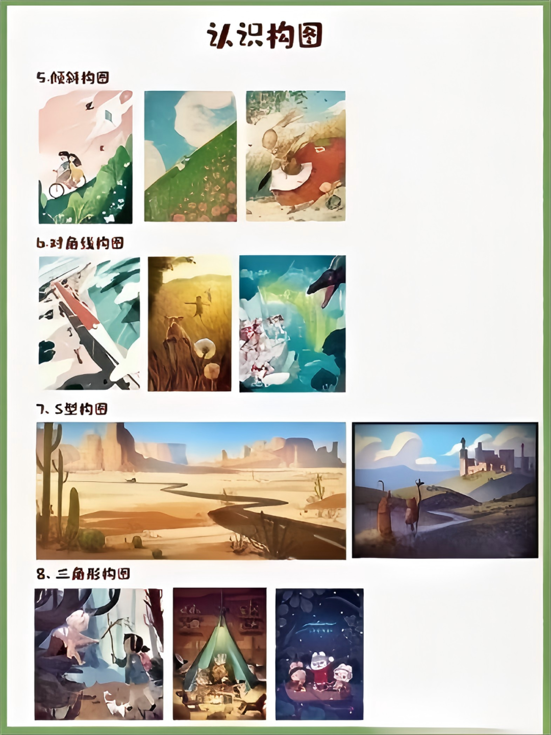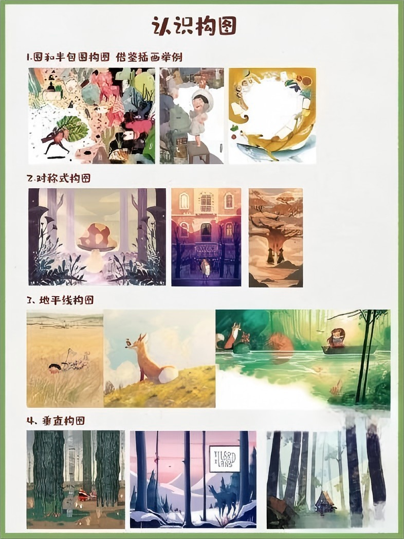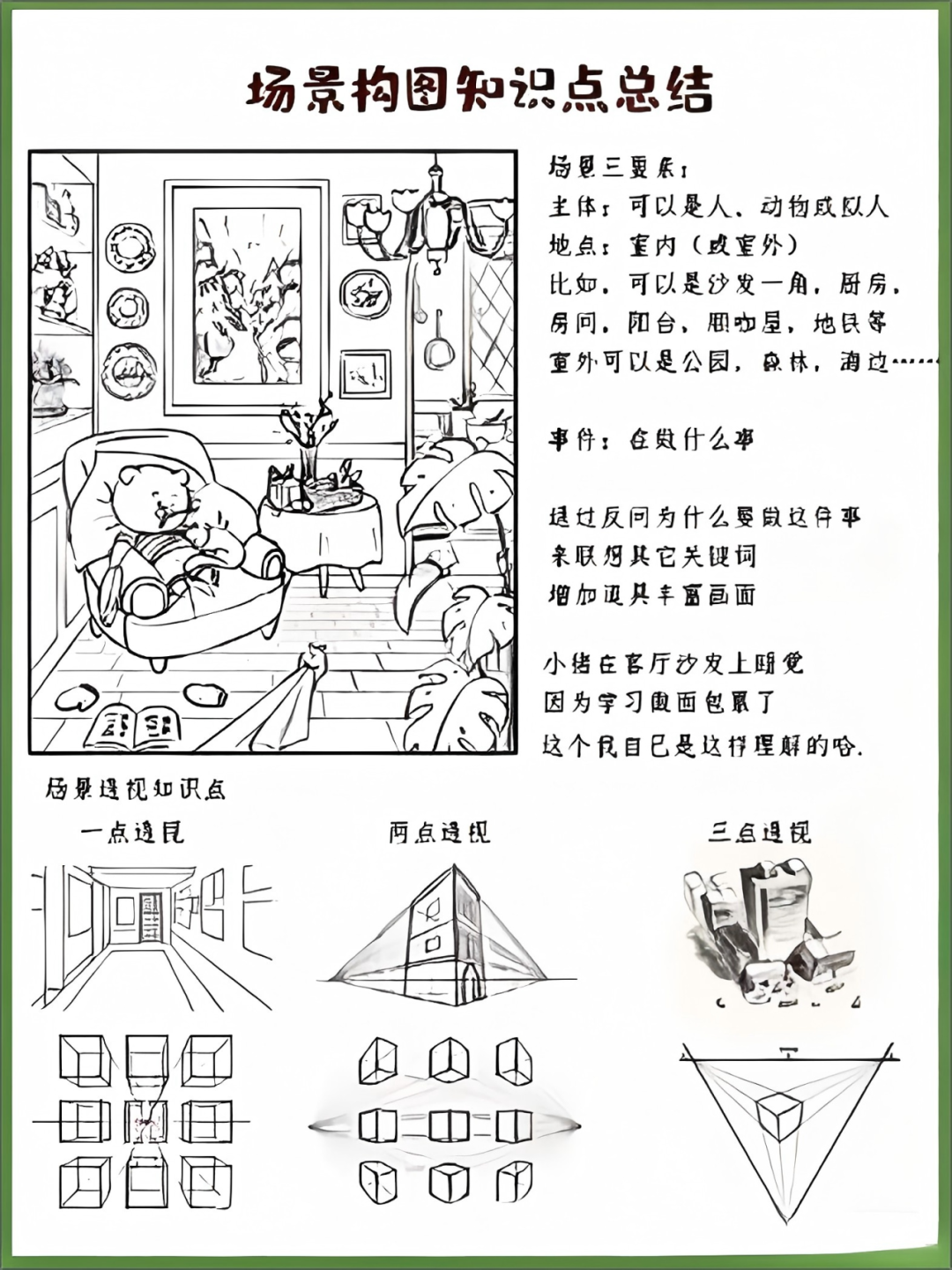 课时安排3-4课时动漫插画场景设计1、场景三要素:主体、地点、事件2、场景透视知识点:一点透视、两点透视、三点透视认识构图:围和半包围构图、对称式构图、地平线构图、垂直构图、倾斜构图、对角线构图、S型构图、三角形构图、黄金分割、框架式构图、分段式构图、光影构图