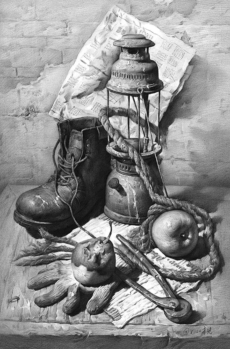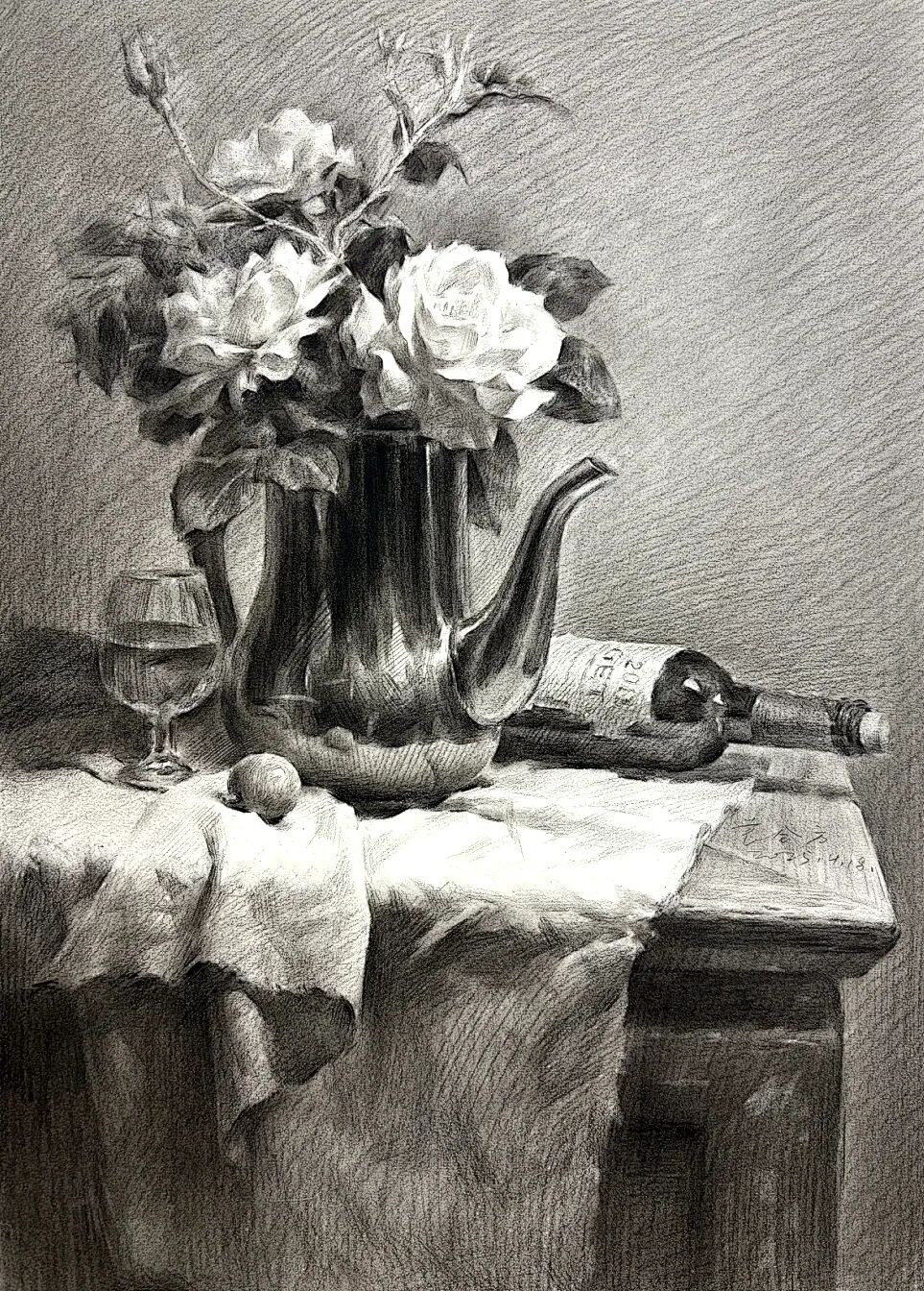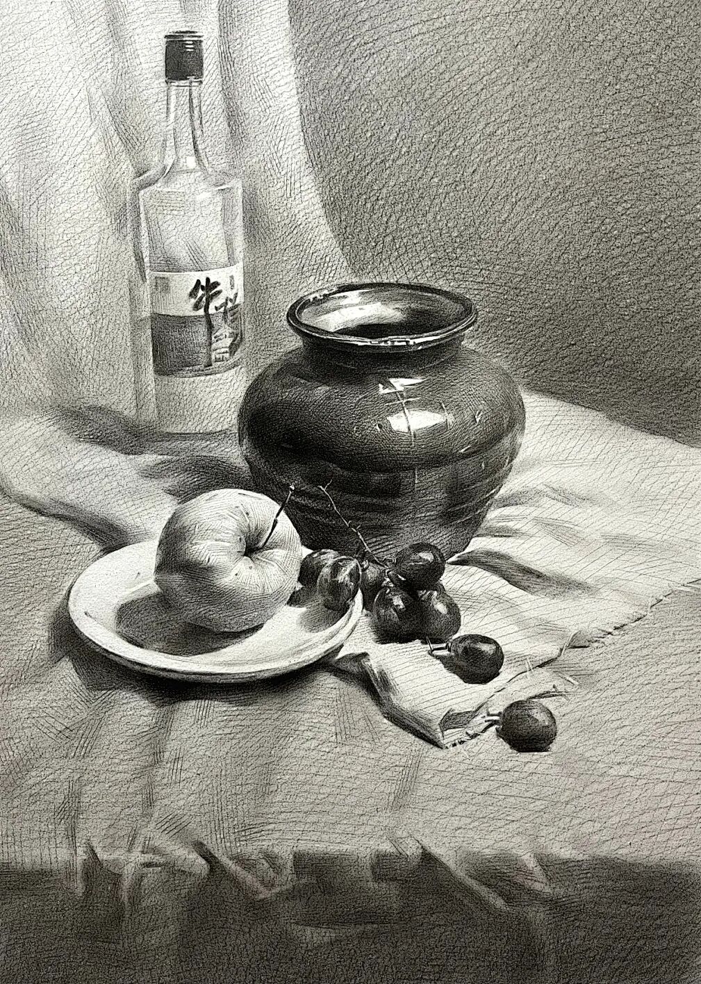 # 静物素描 #静物素描是以日常生活中常见的物体为描绘对象,使用单一颜色(通常是铅笔),通过线条和色调来表现物体的形状、结构、质感、空间感以及光影关系的绘画形式 。描绘对象涵盖范围广泛,包括但不限于各种蔬果(如苹果、香蕉、西红柿 )、器皿(如陶罐、瓷瓶、玻璃杯 )、文具(如书本、钢笔、闹钟 )、花卉(如菊花、玫瑰的干花 )、织物(如衬布 )以及一些小型的工艺品等。这些物体往往被有目的地组合摆放在一起,形成具有一定形式美感和主题倾向的静物组合。