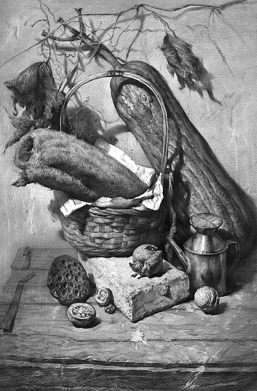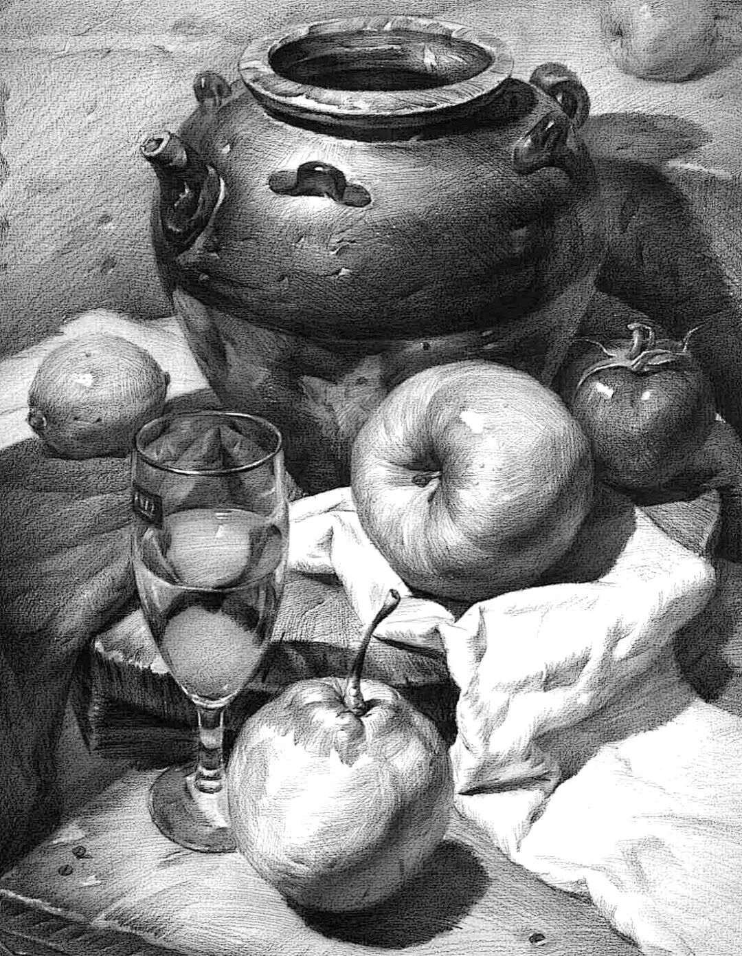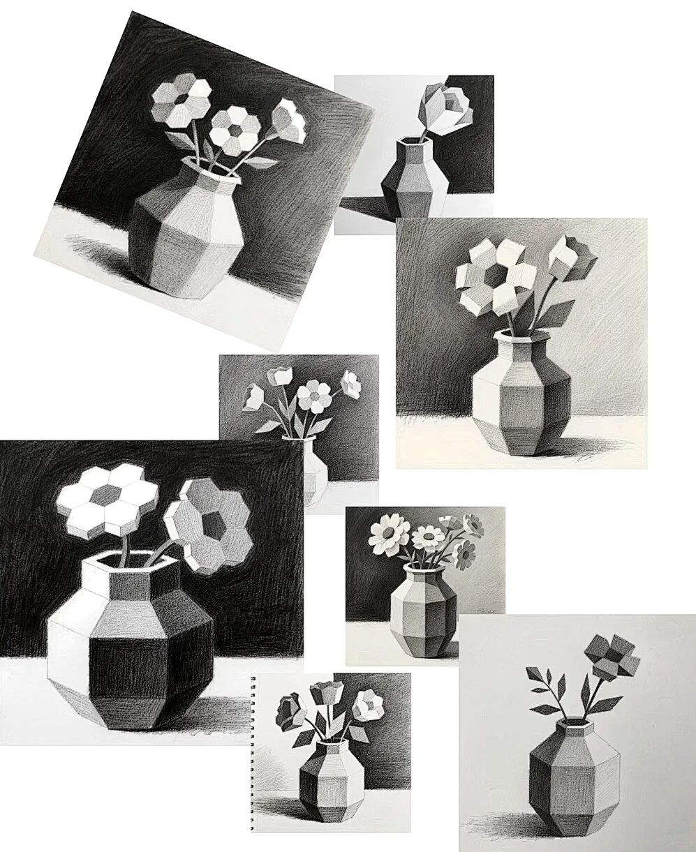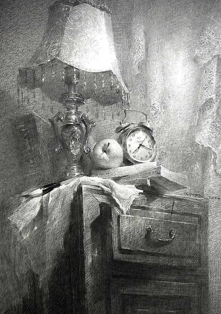 # 静物素描 #静物素描是以日常生活中常见的物体为描绘对象,使用单一颜色(通常是铅笔),通过线条和色调来表现物体的形状、结构、质感、空间感以及光影关系的绘画形式 。描绘对象涵盖范围广泛,包括但不限于各种蔬果(如苹果、香蕉、西红柿 )、器皿(如陶罐、瓷瓶、玻璃杯 )、文具(如书本、钢笔、闹钟 )、花卉(如菊花、玫瑰的干花 )、织物(如衬布 )以及一些小型的工艺品等。这些物体往往被有目的地组合摆放在一起,形成具有一定形式美感和主题倾向的静物组合。