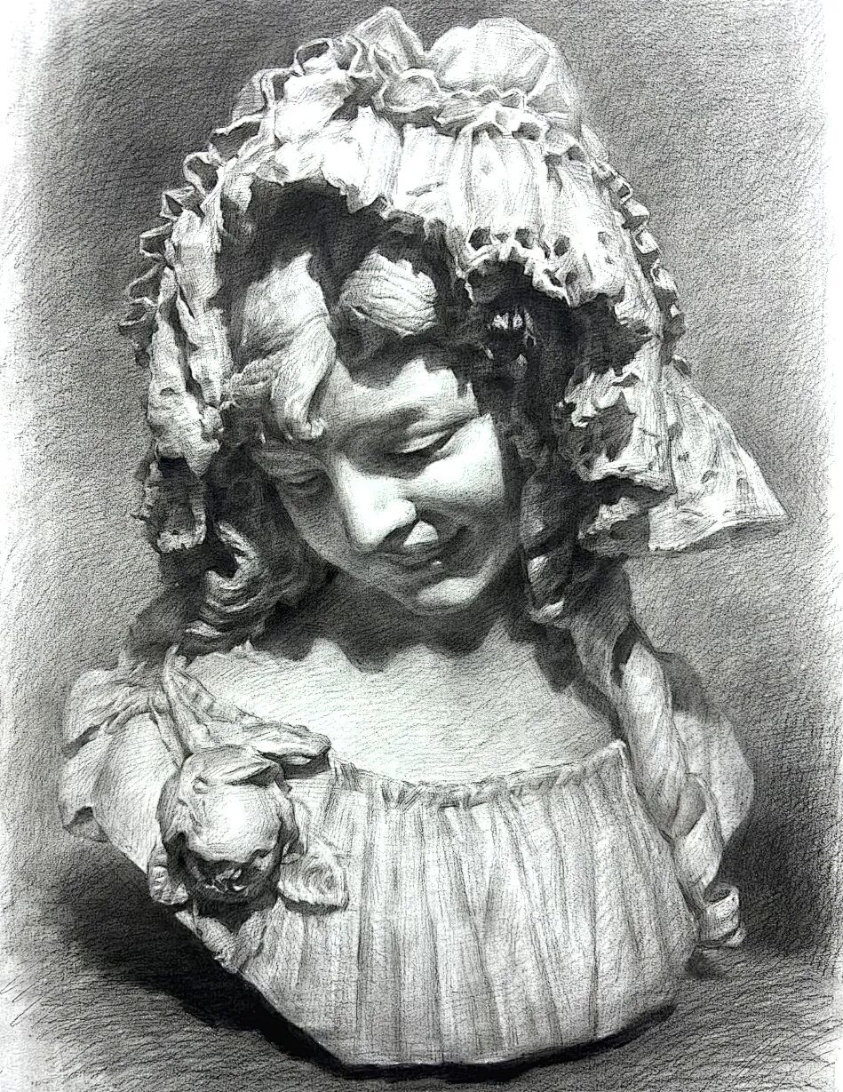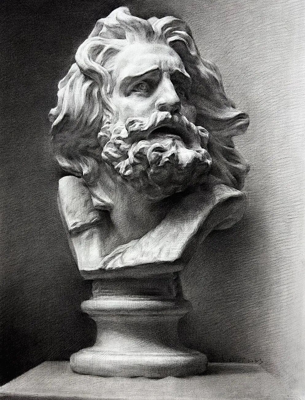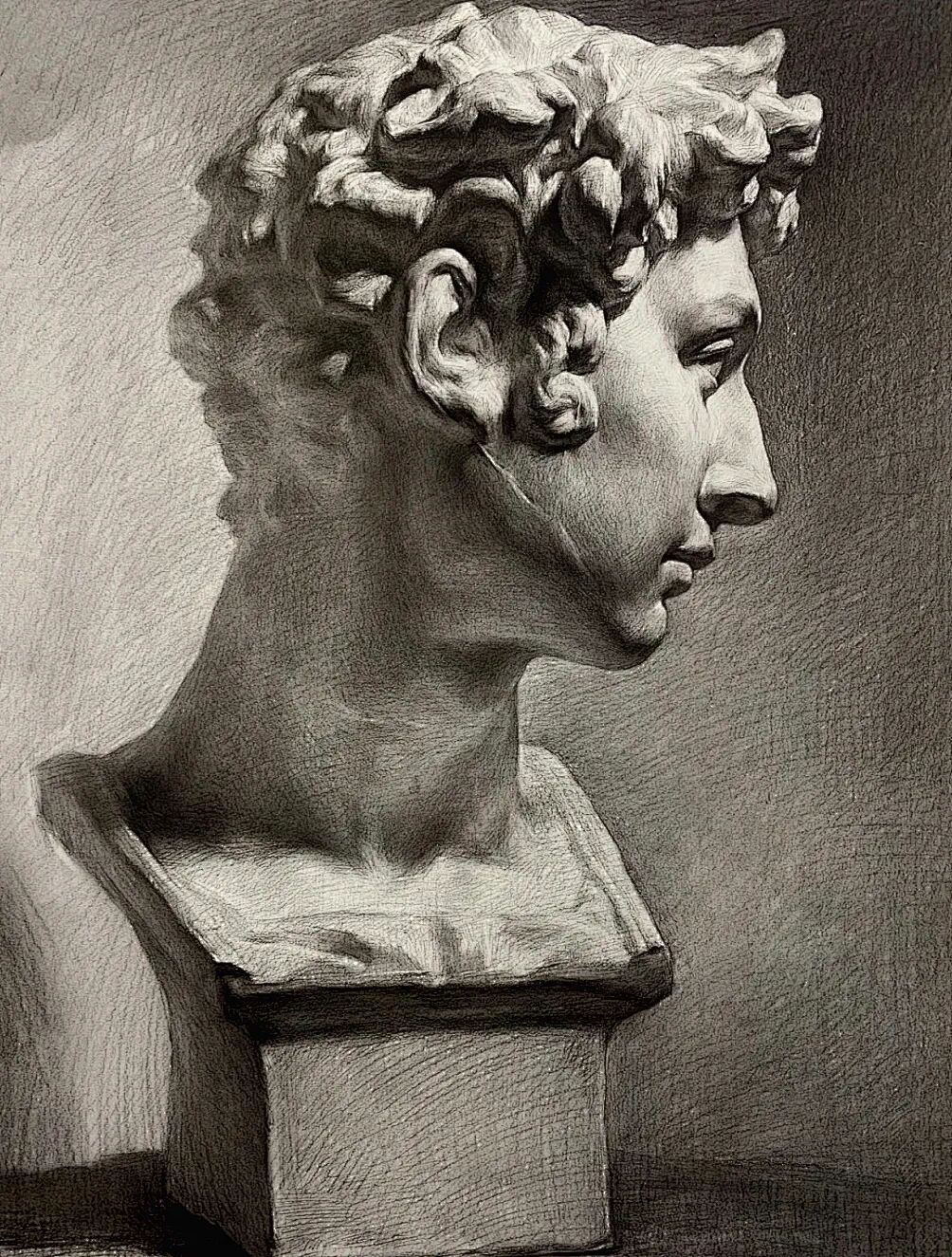 #石膏头像素描 #主要为经典的石膏头像模型,多取材于古希腊、古罗马的雕塑作品(如《大卫》《维纳斯》),或是文艺复兴时期的经典人像雕塑。这些模型结构清晰、形态规范,且颜色单一(通常为白色),能排除真人皮肤、毛发等复杂色彩和质感的干扰,便于集中研究头部的骨骼结构、肌肉起伏和整体造型规律。